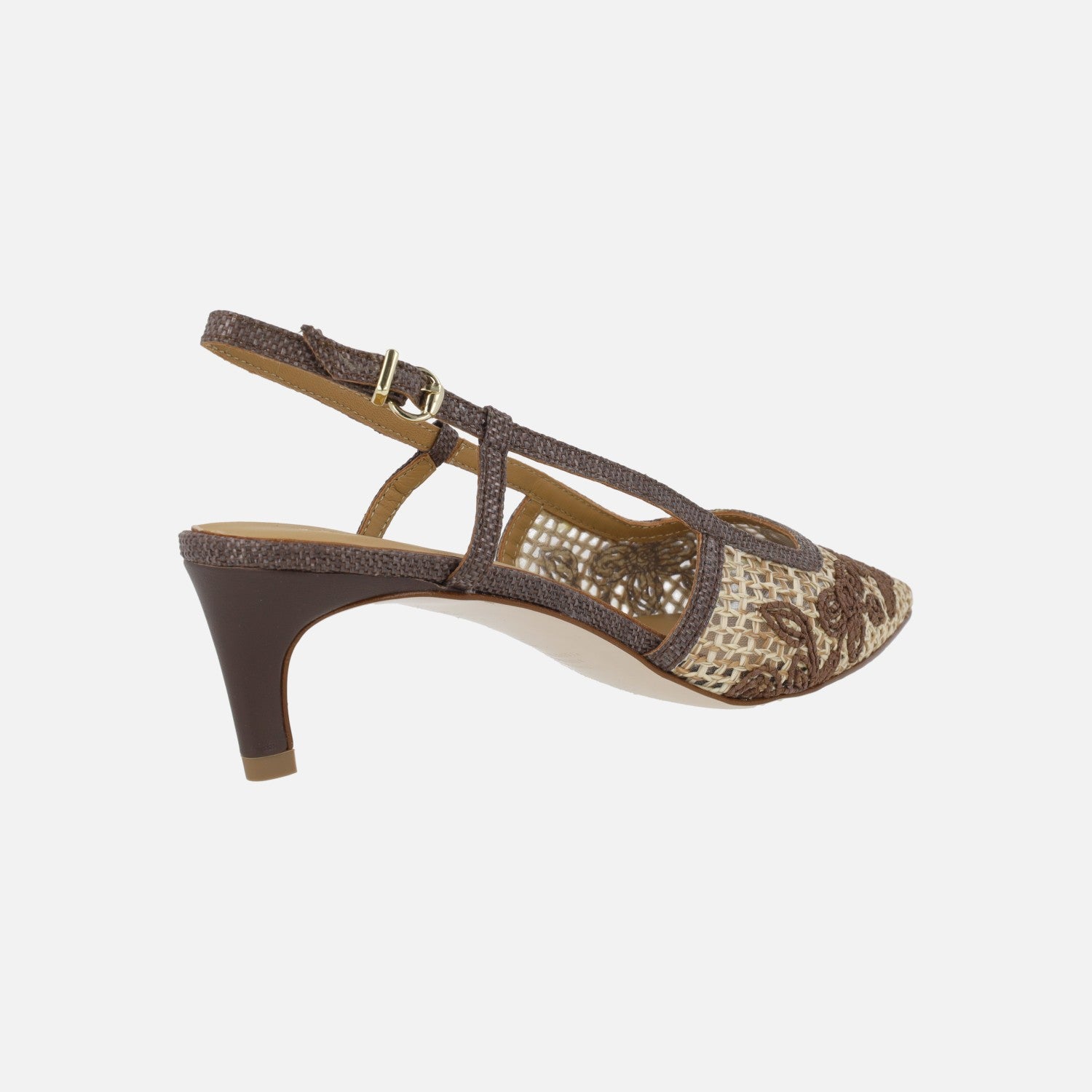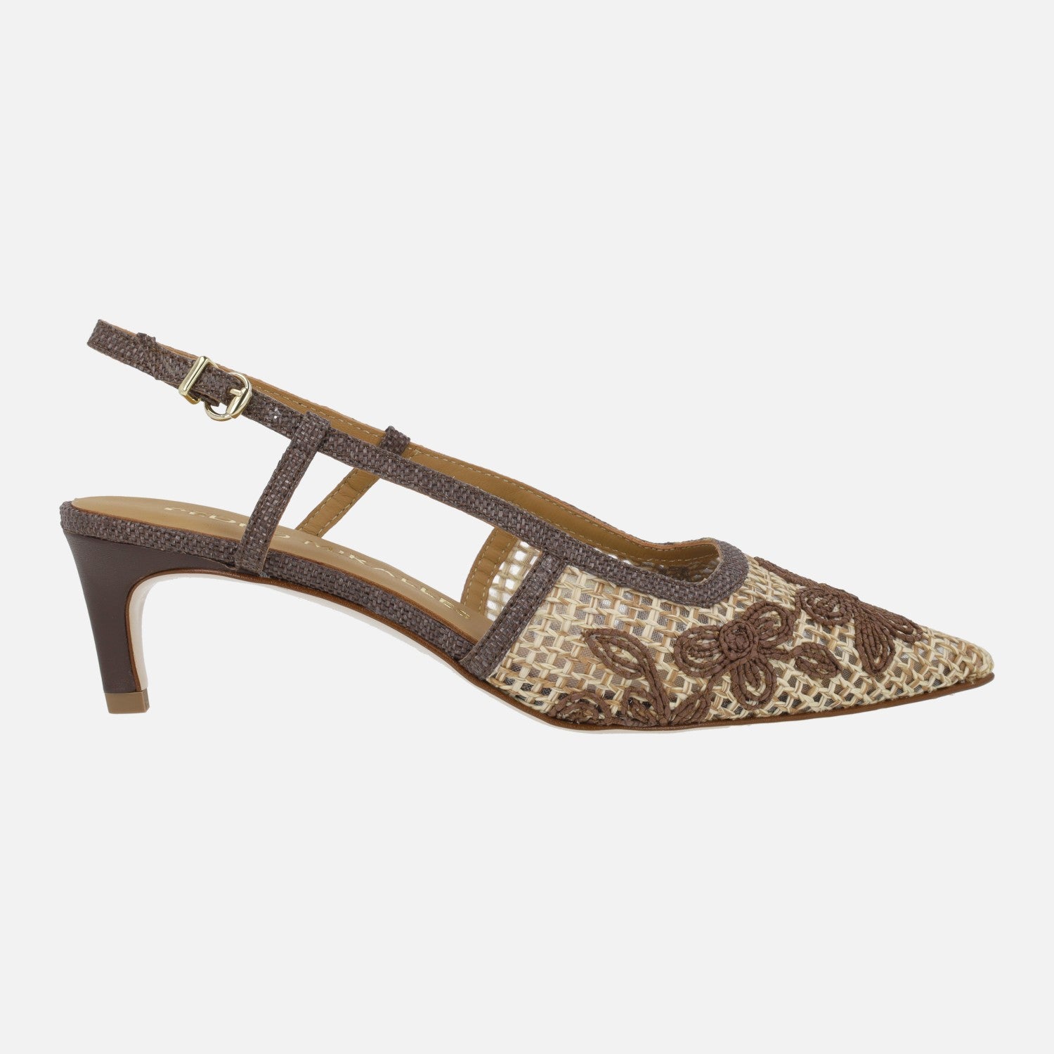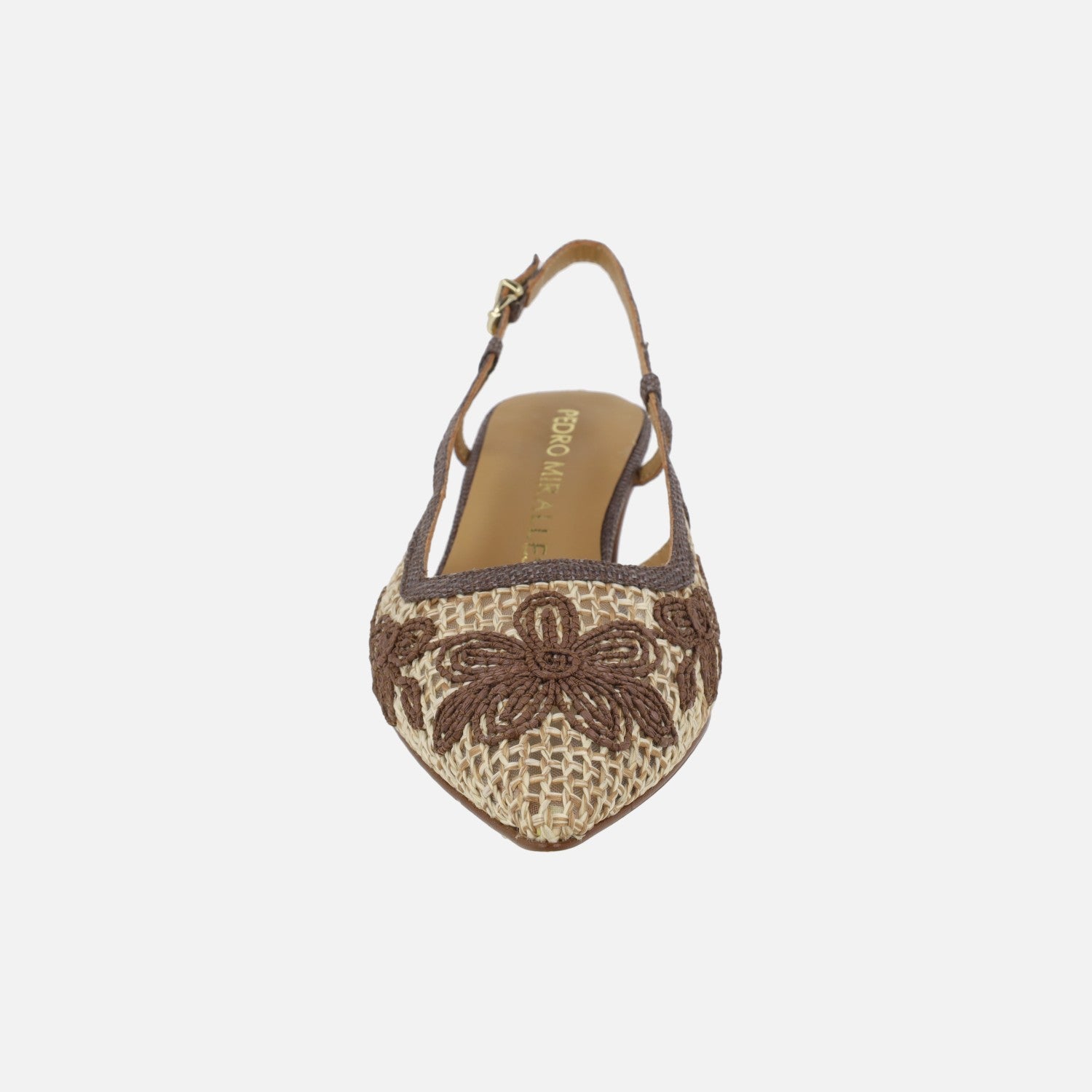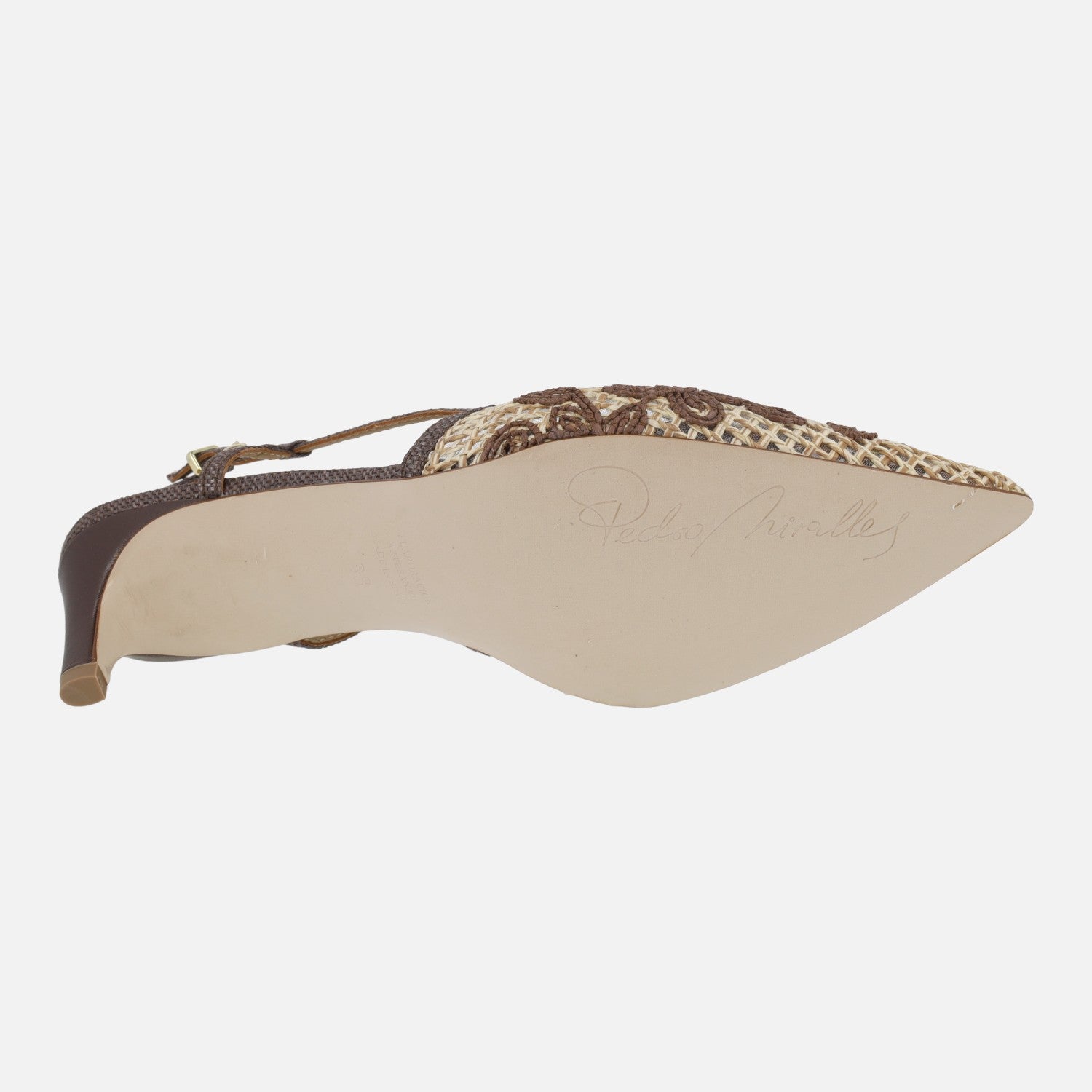 Preciosos zapatos corte salón, destalonados, de la marca Pedro Miralles, modelo 18733. Zapatos con diseño de rafia, disponibles en negro o en marrón/camel. Precioso detalle de flores bordadas. Tira al talón ajustable con hebilla. Interiores forrados de piel y tejido. Tacones bajos, de 5,5 cm de altura aproximadamente.