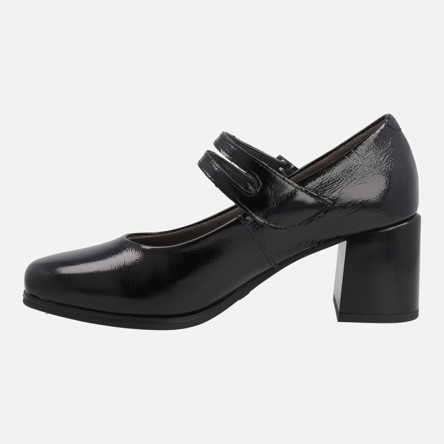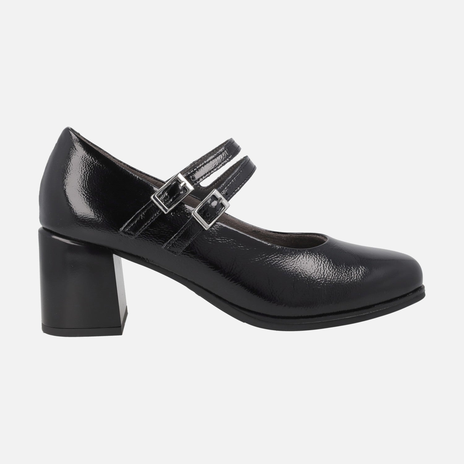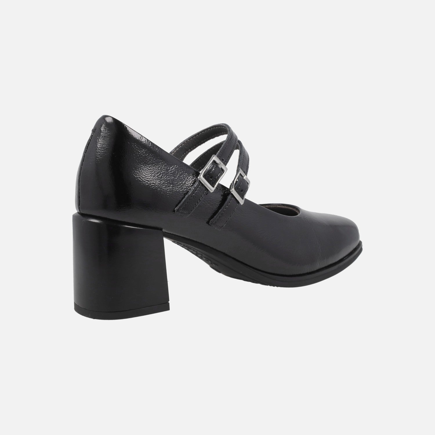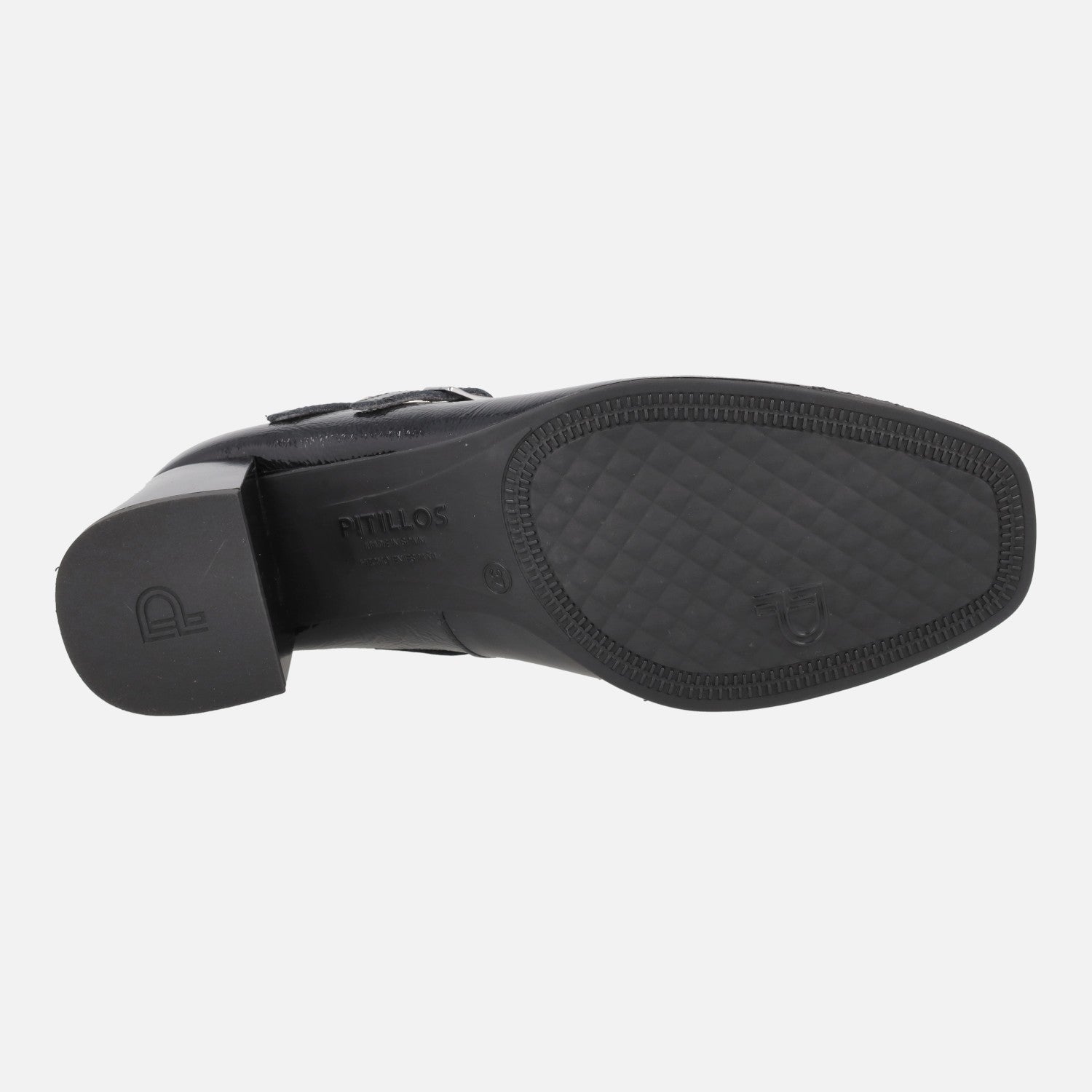 Preciosos zapatos corte salón estilo mary jane (merceditas) de la marca española Pitillos, modelo 10831 Negro. Zapatos de tacón, elaborados en piel charol color negro, con dos pulseras que cruzan el empeine y cierran con hebilla. Interior textil con plantillas extraíbles. Piso sintético. Tacones de 6 cm. Made in Spain.