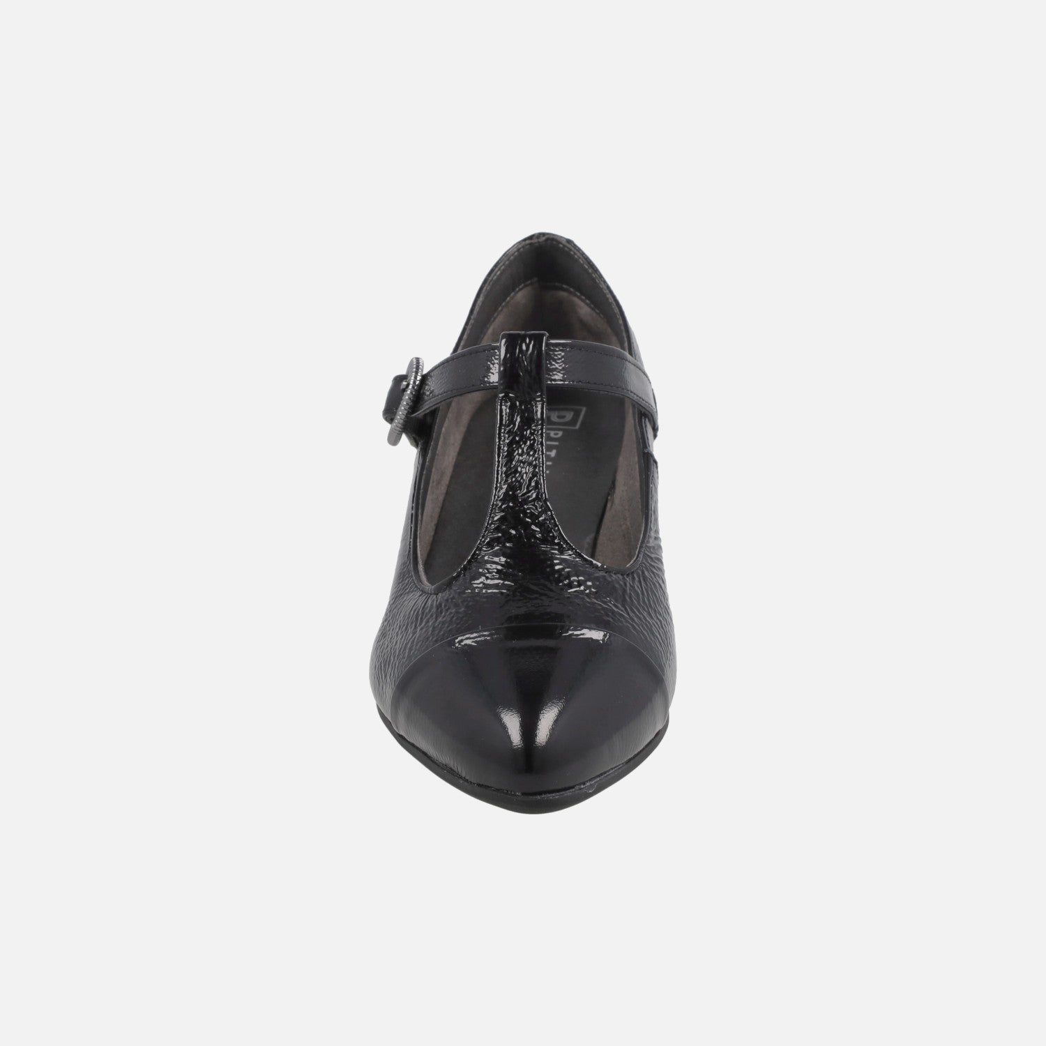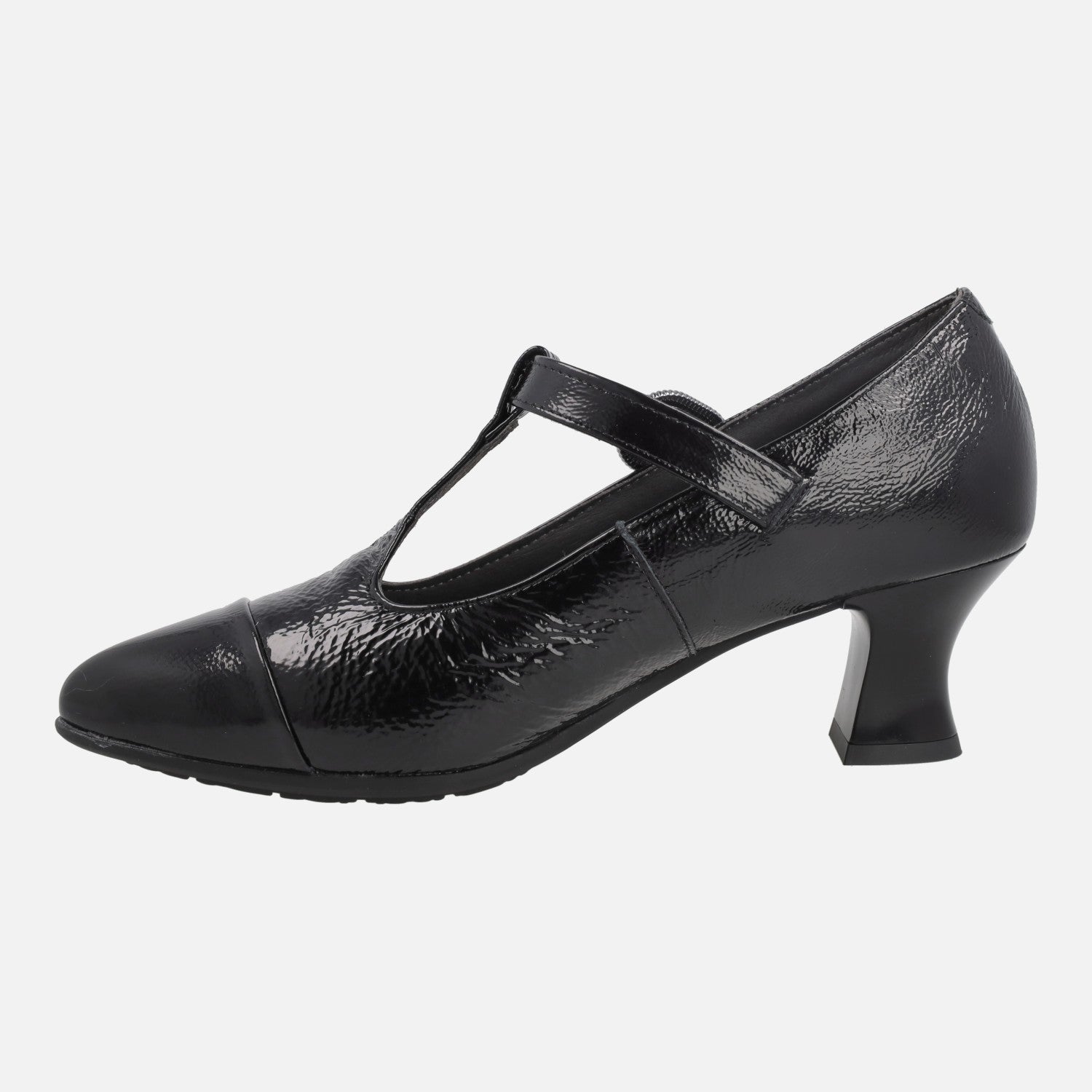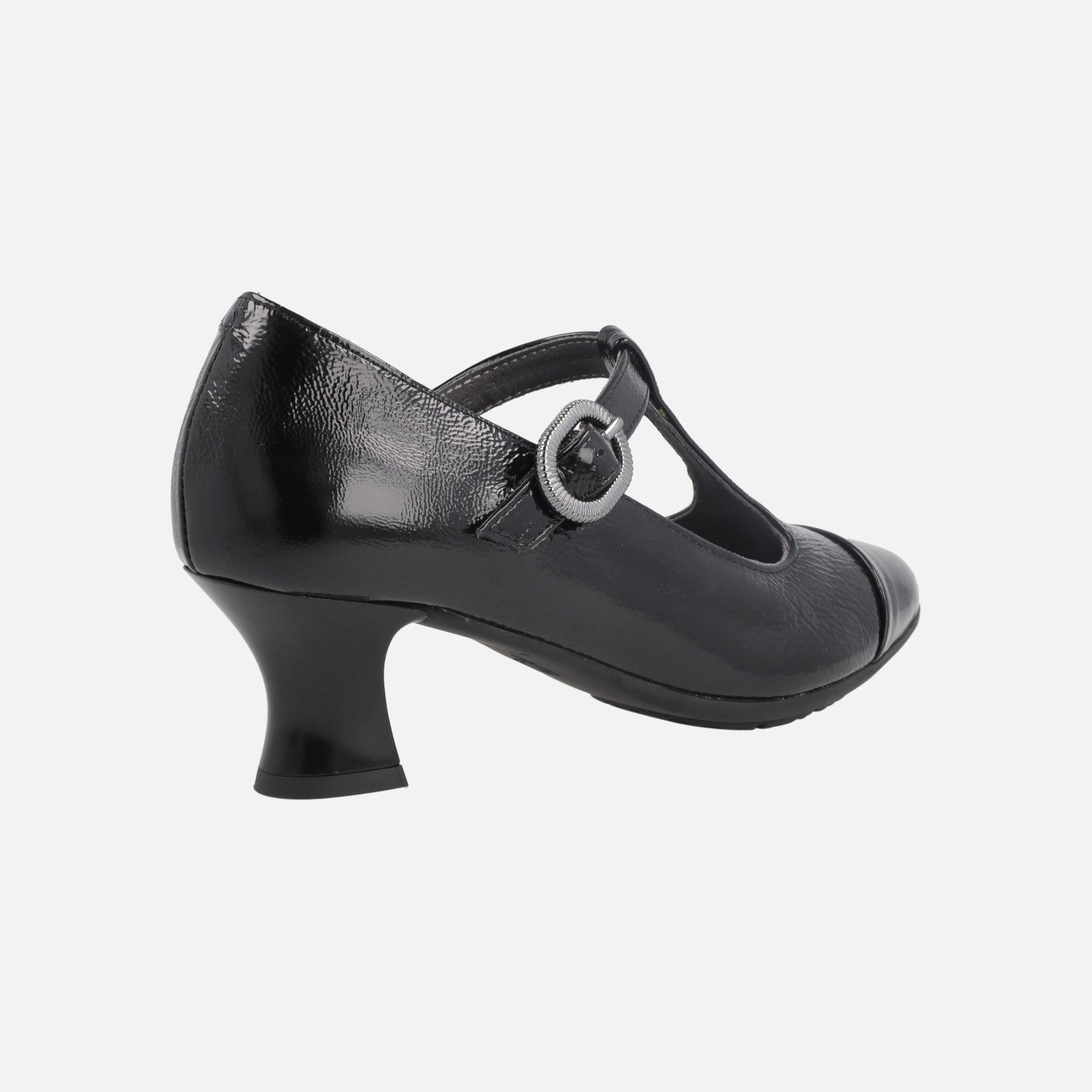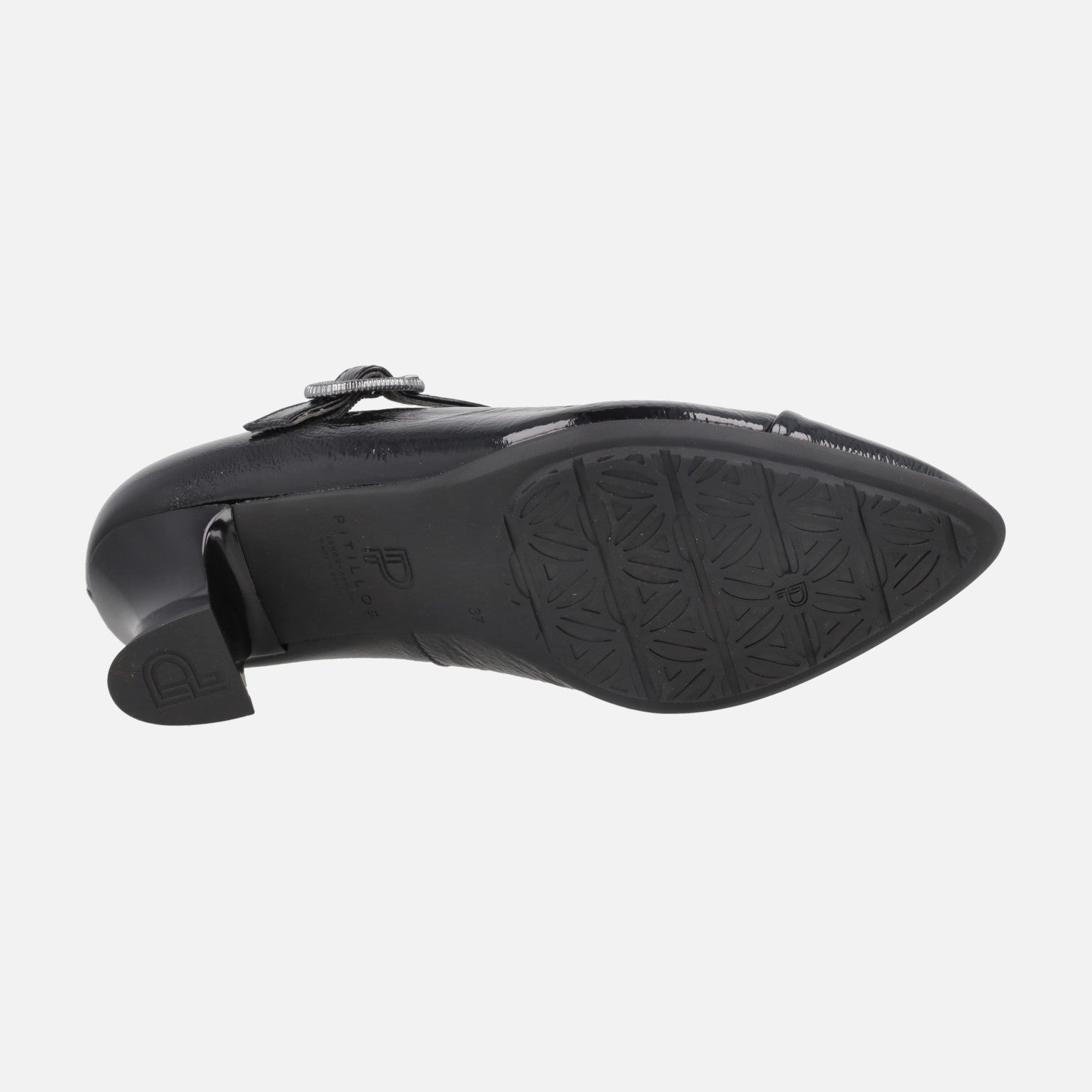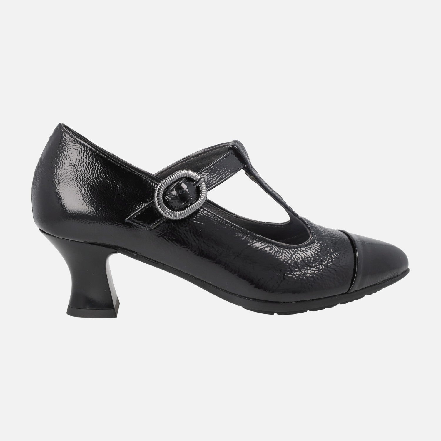 Zapatos de tacón modelo 10853 Negro de la marca Pitillos. Zapatos elaborados en charol negro, con una tira que cruza el empeine en forma de T y cierre con hebilla. Interior textil. Tacones de 5,5 cm. Made in Spain.