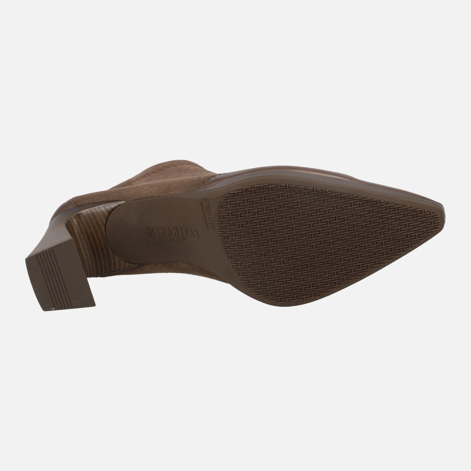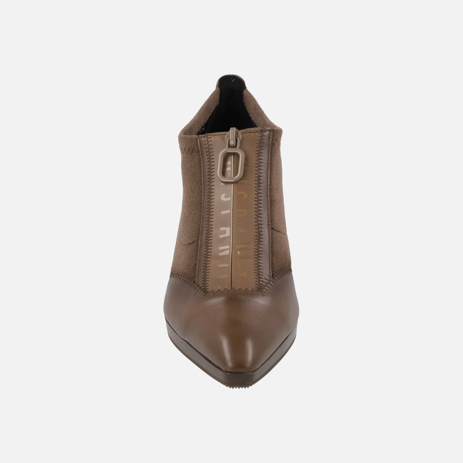 Zapatos de tacón modelo HI254324 Avellana, de la marca Hispanitas. Zapatos elaborados en materiales elásticos, con cremallera frontal y detalles en piel en la talonera y la puntera. Horma ligeramente afilada. Tacones de 7,5 cm de altura, con pequeña plataforma delantera de 1,5 cm. Piso sintético. Made in Spain.