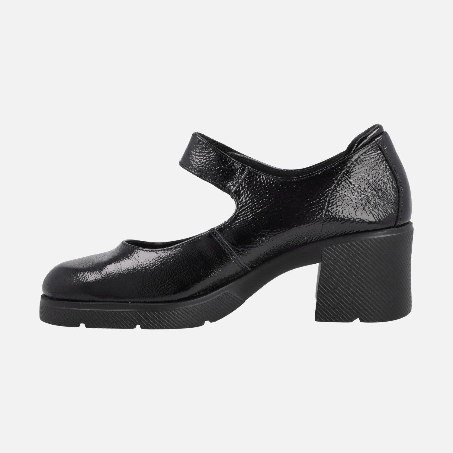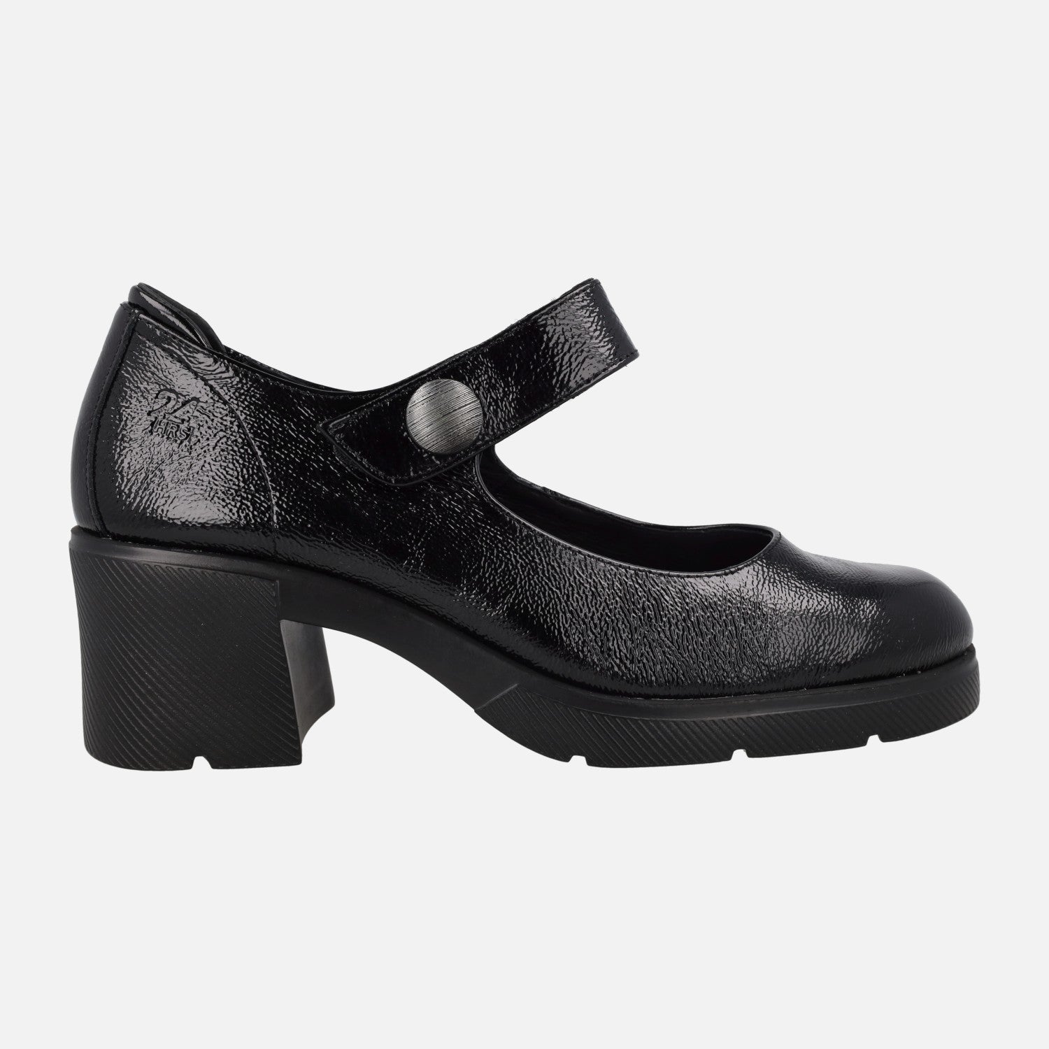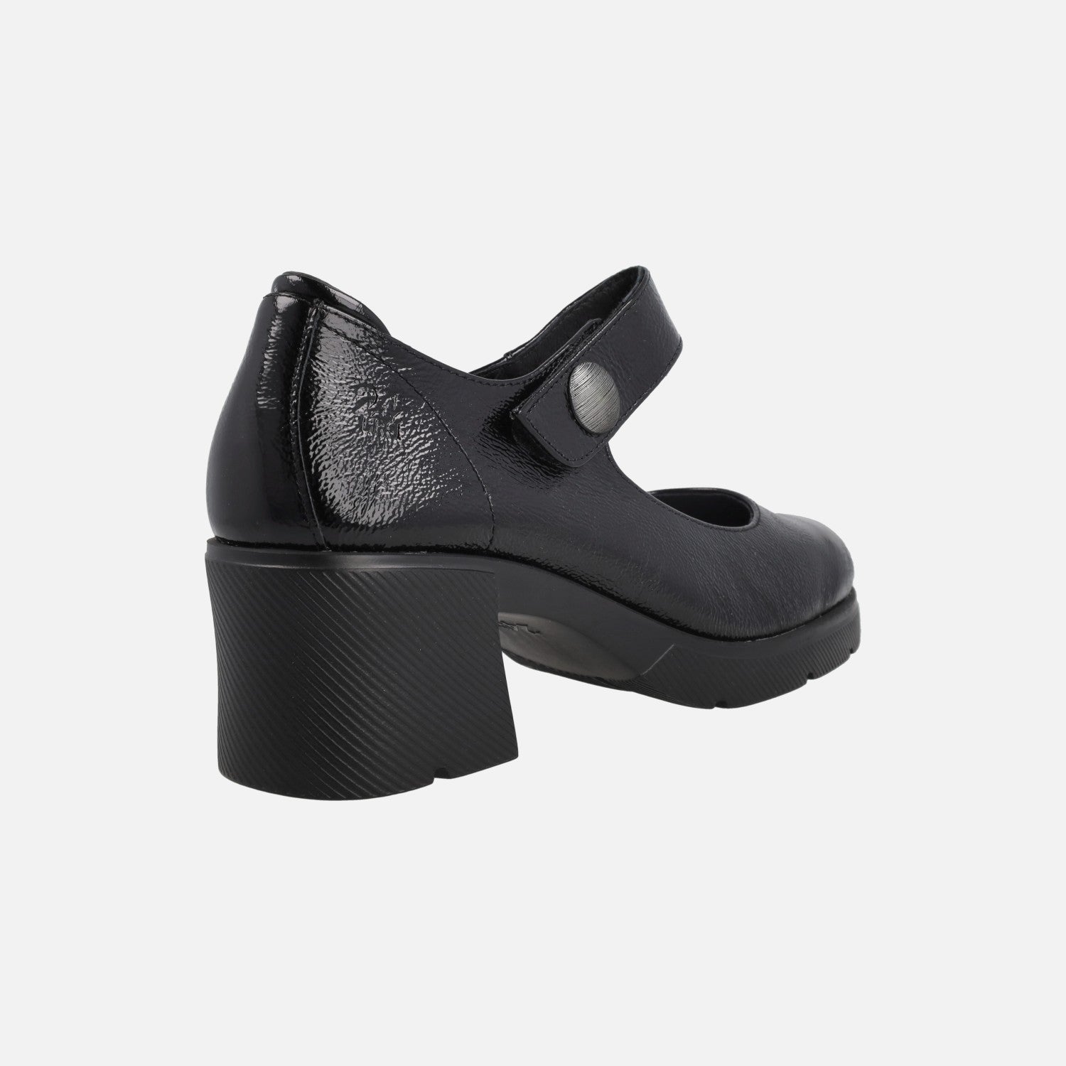 Zapatos de tacón para mujer de la marca española 24 Horas, modelo 26605 Napalak negro. Zapatos estilo mercedes, con una tira que cruza el empeine y cierra con velcro (lleva en el extremo un botón metálico de adorno). Exterior en piel charol negro. Interiores forrados de piel. Suela sintética, con 6 cm de tacón (2 cm de plataforma).