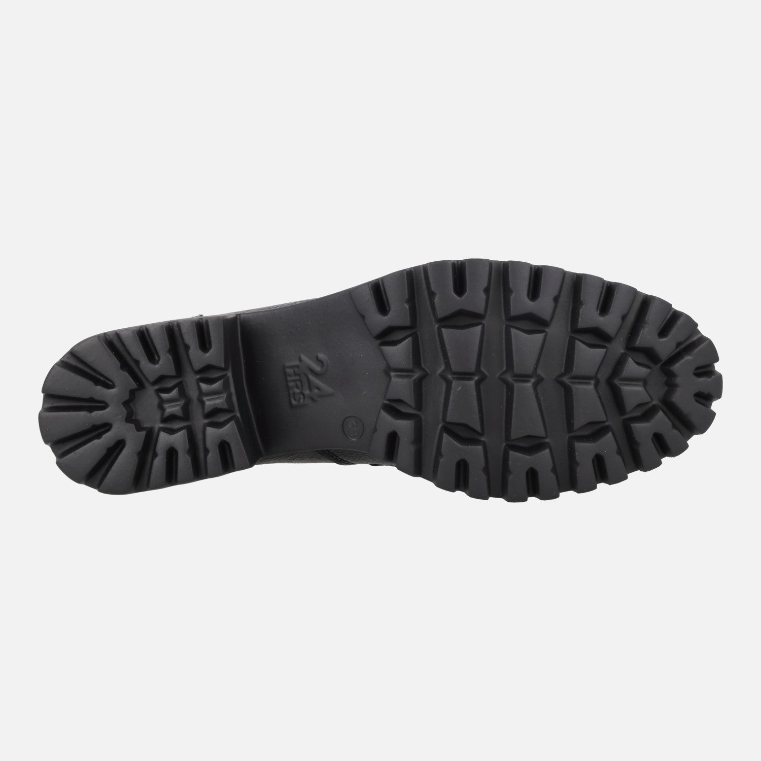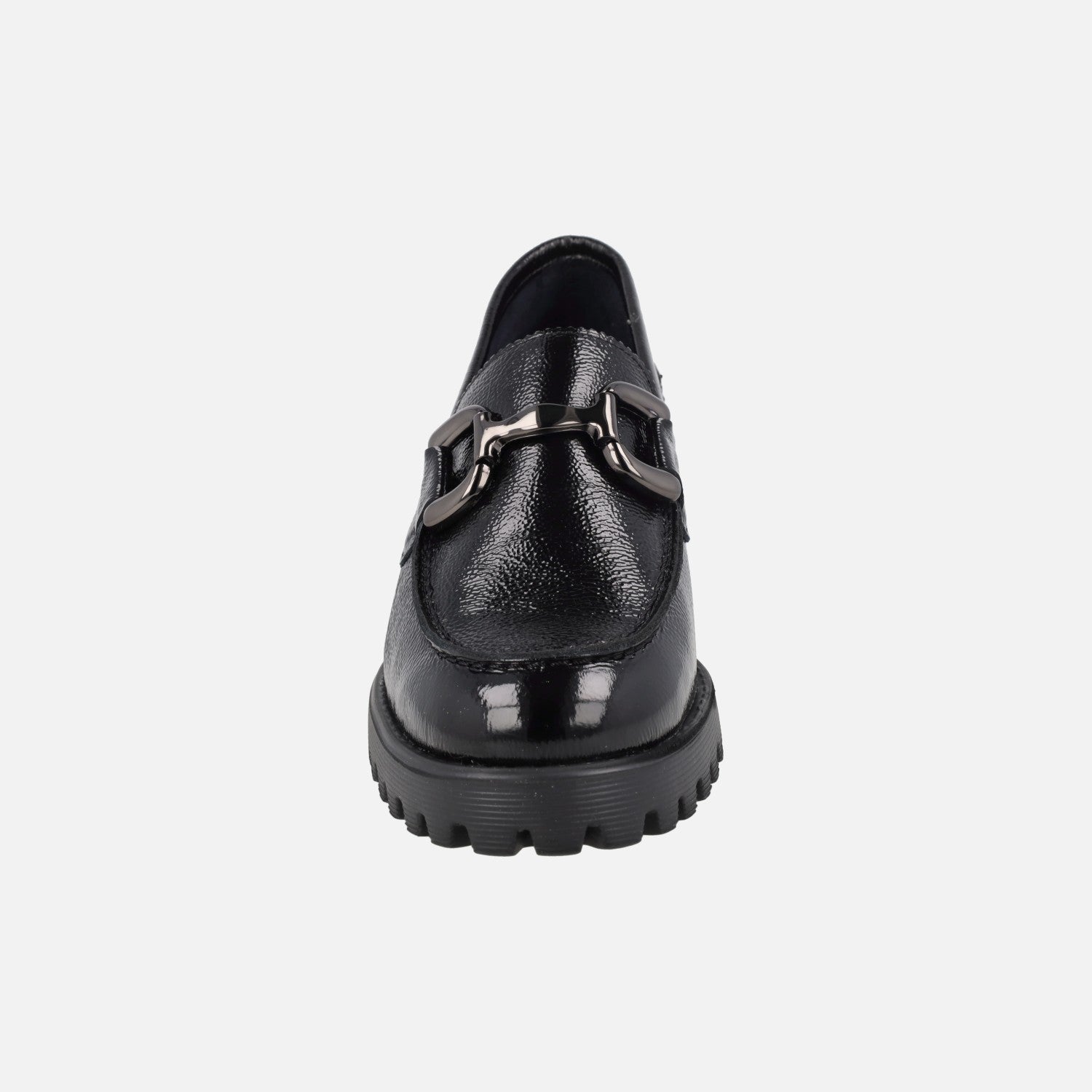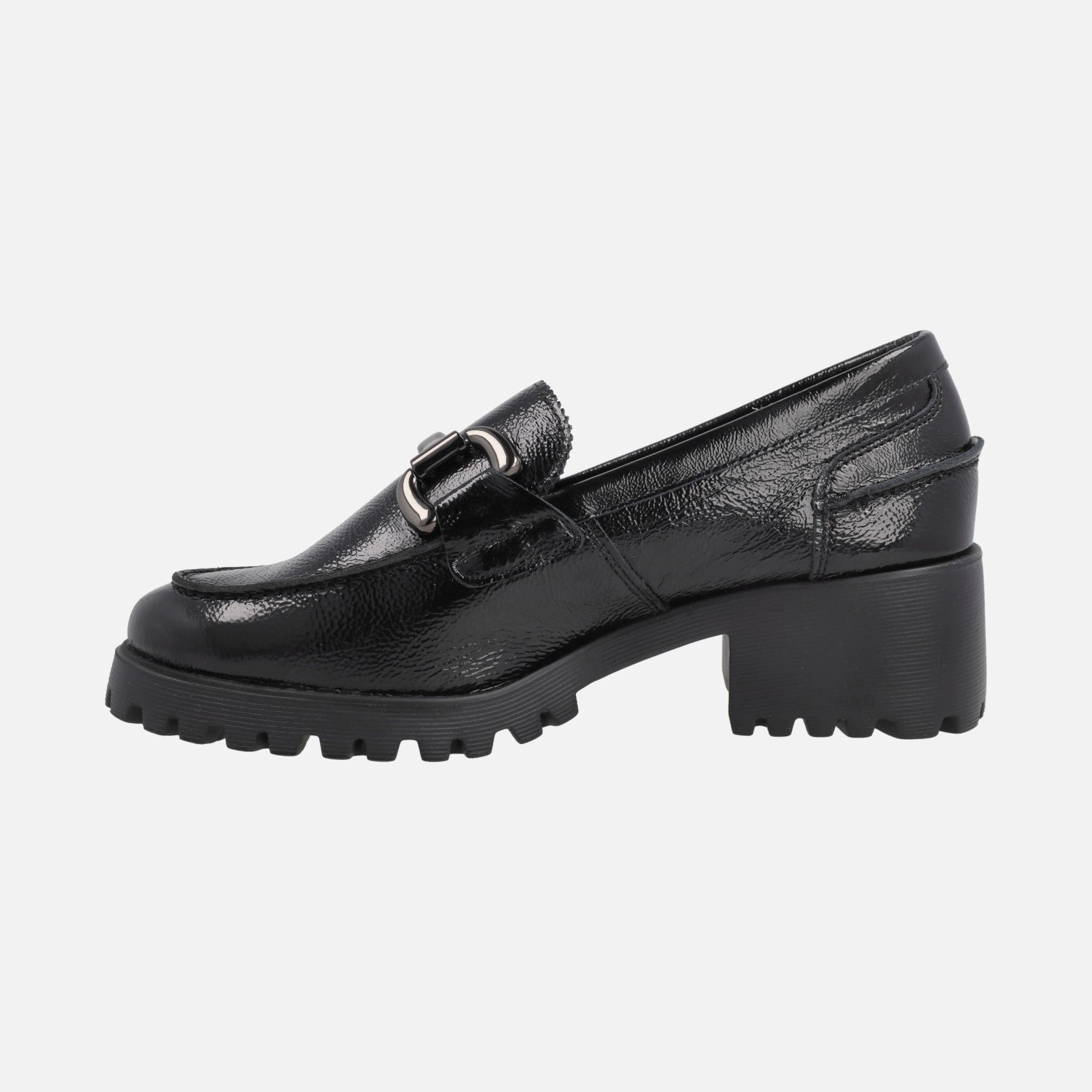Mocasines de tacón para mujer de la marca 24 Horas modelo 26565 Negro. Zapatos confort elaborados en piel charol color negro con adorno metálico en el empeine. Interiores forrados de piel. Piso sintético con tacones de 4,5 cm de altura (2 cm plataforma delantera).