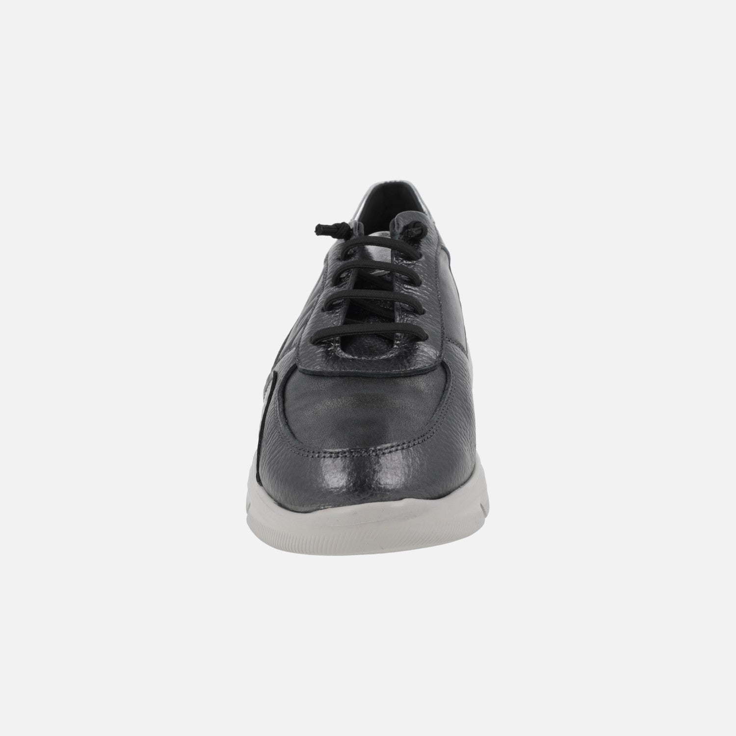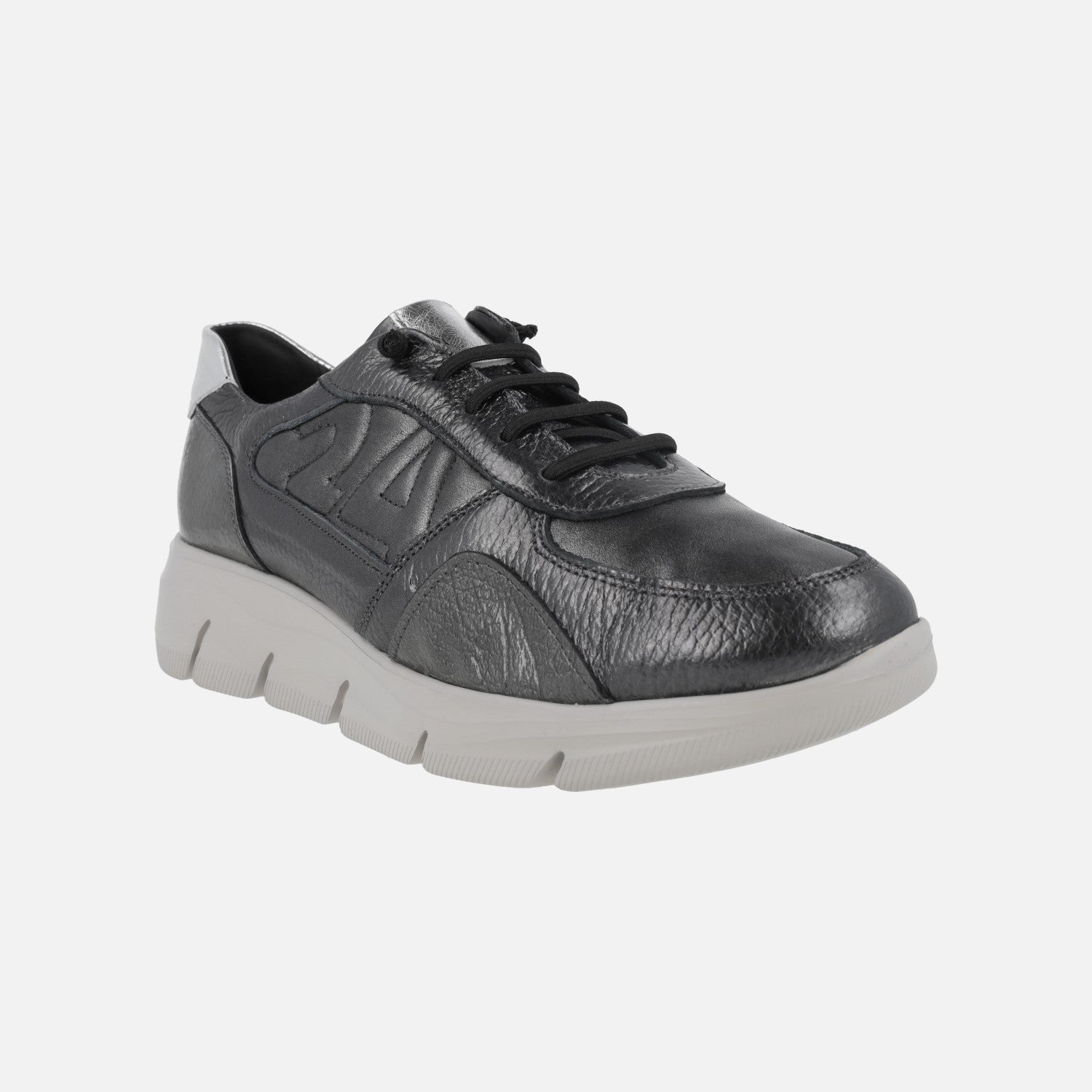 Zapatos deportivos confort para mujer de la marca 24 Horas, modelo 26617 Antracita. Elaborados en piel y charol, en color gris con cierre de cordones elásticos. Interiores forrados de piel con plantillas extraíbles. Piso sintético, con 4 cm de altura trasera y 2 cm en la parte delantera.