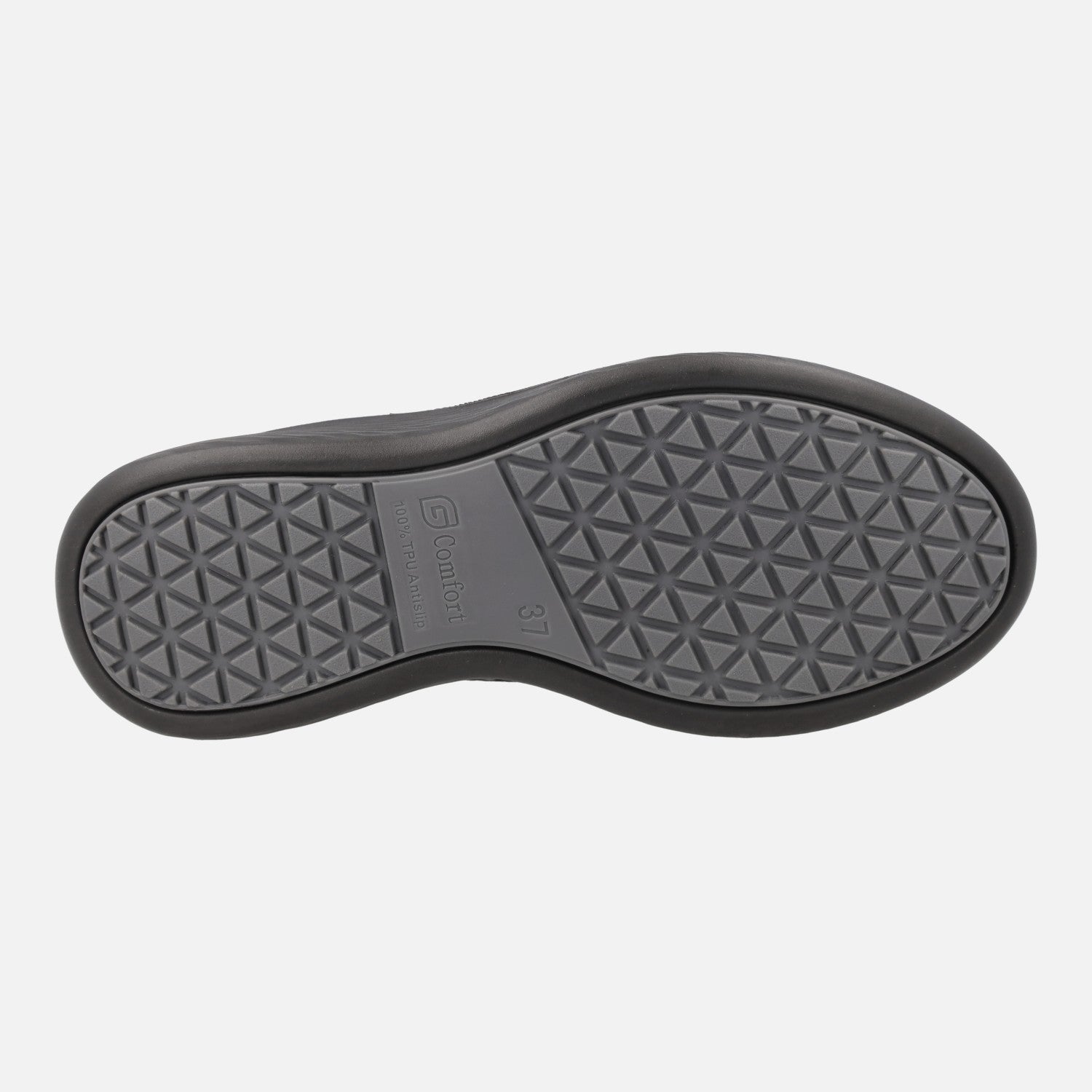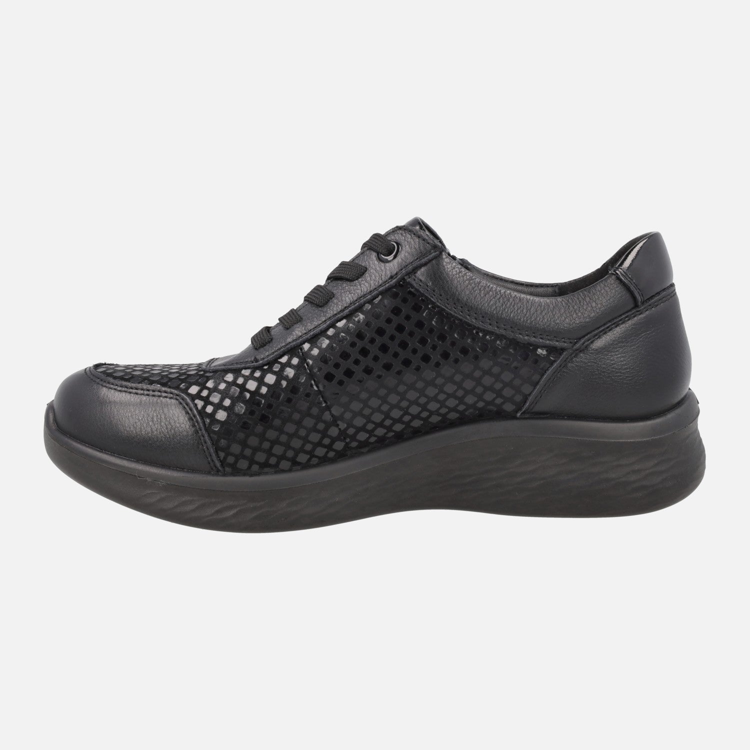 Zapatos deportivos para mujer de la marca G Comfort modelo P-819SW Schwarz fantasy. Deportivos confort, de calce ancho, elaborados en piel negra con detalles en charol y fantasía. Cierre de cordones y además cremallera lateral para faciliar el calce. Membrana interior impermeable TEX. Forro textil, plantillas extraíbles de piel. Piso sintético con 3,5 cm de cuña trasera (2 cm parte delantera).