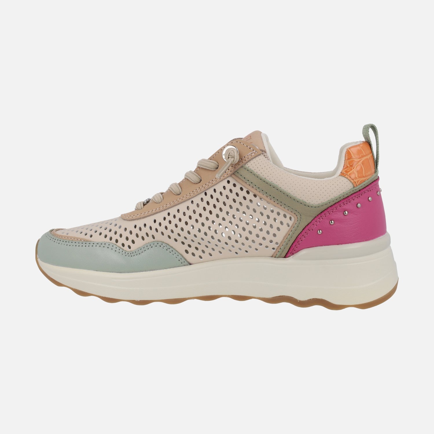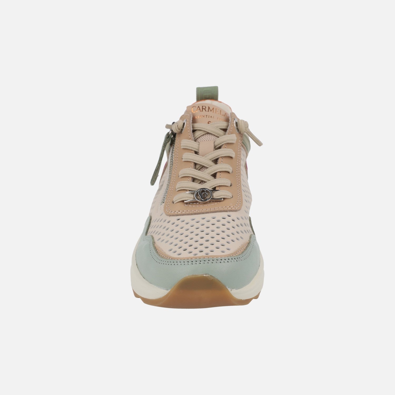 Zapatos deportivos para mujer de la marca Carmela shoes modelo 163098, disponible en aqua (multicolor) y en beige. Deportivas elaboradas en piel combinando distintos colores, con cierre de cremallera lateral y cordones elásticos. Detalle de picados en la piel y tachas en la talonera. Interior textil, plantillas extraíbles. Piso sintético de 3,5 cm de altura trasera ( 2 cm parte delantera ).