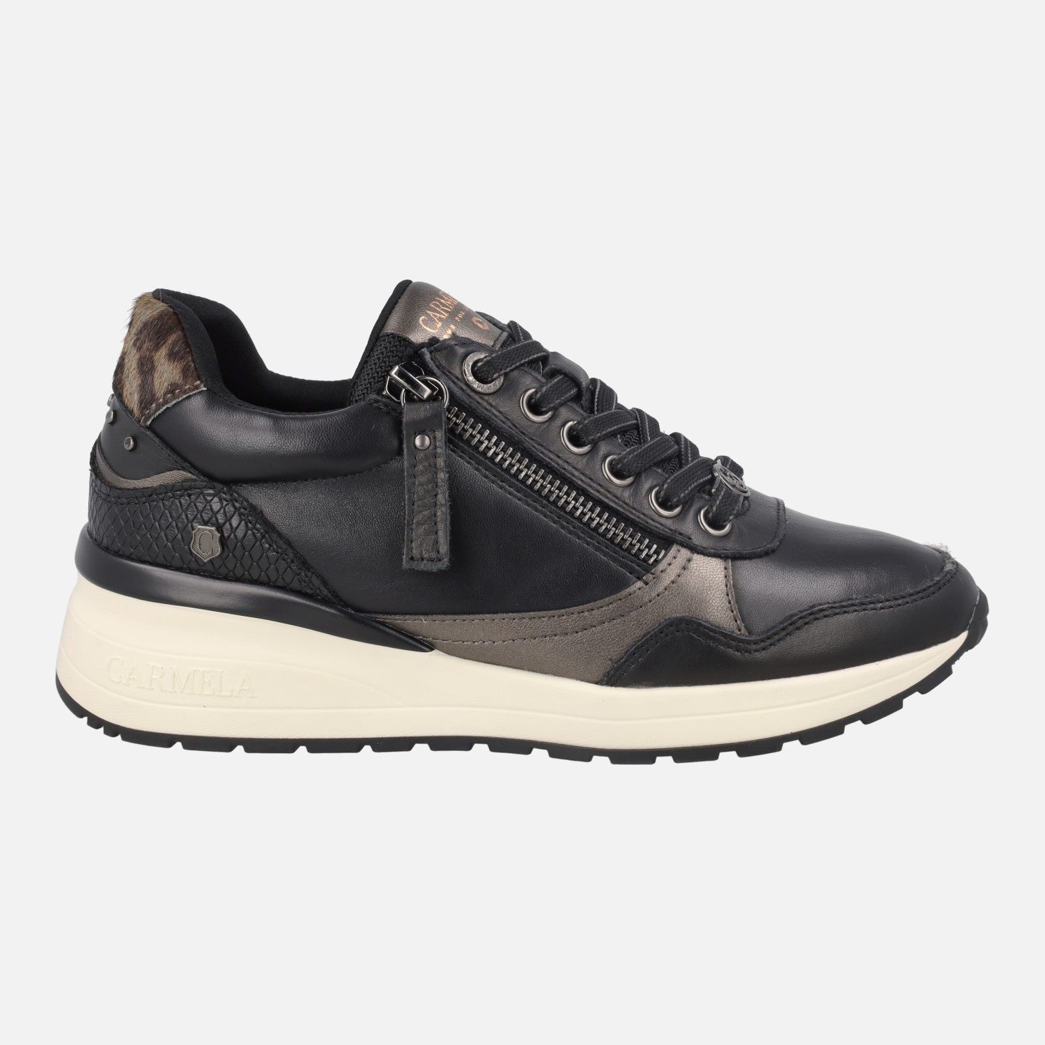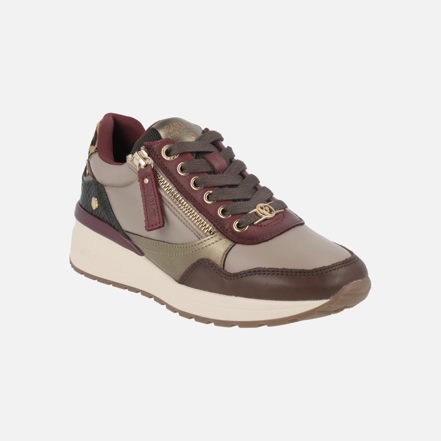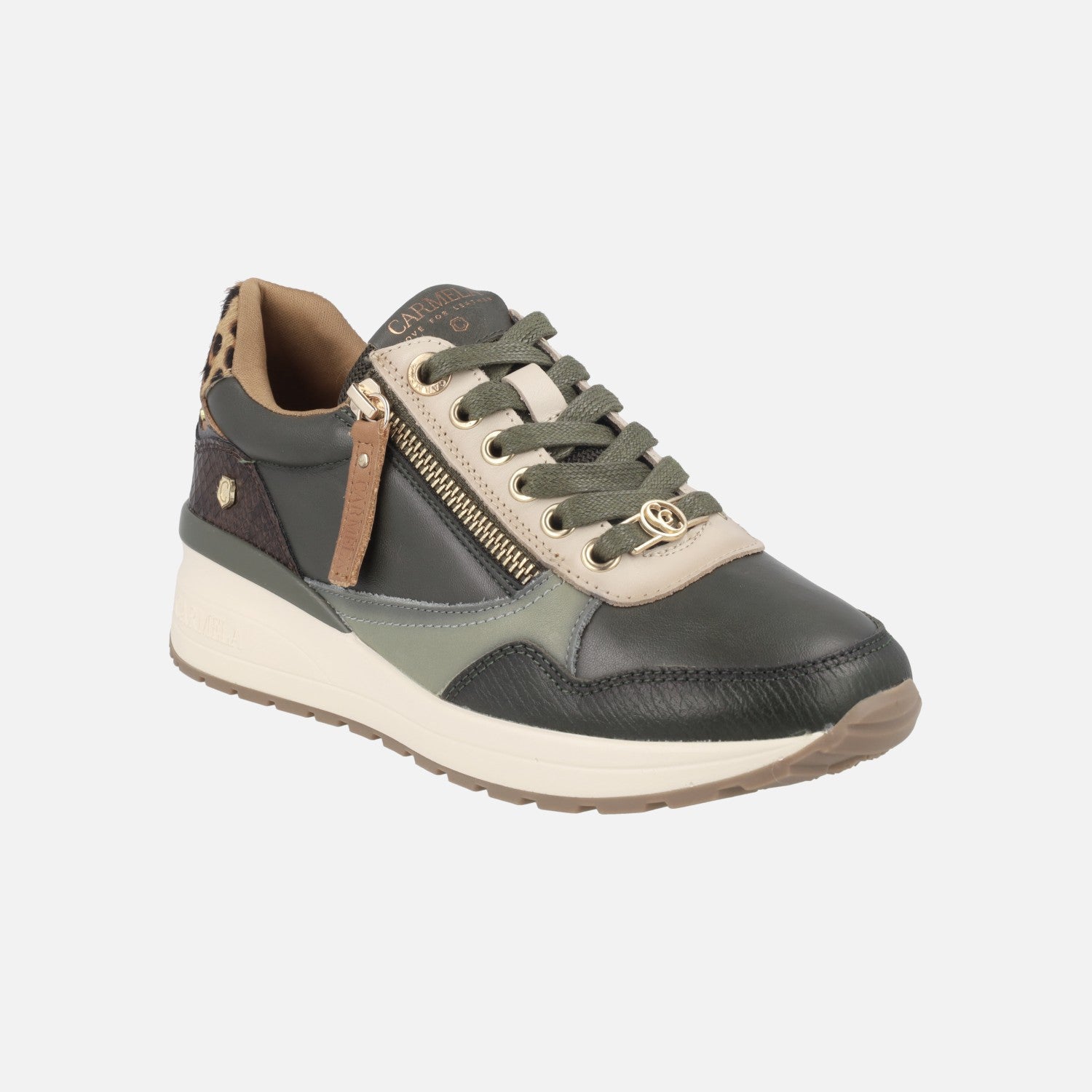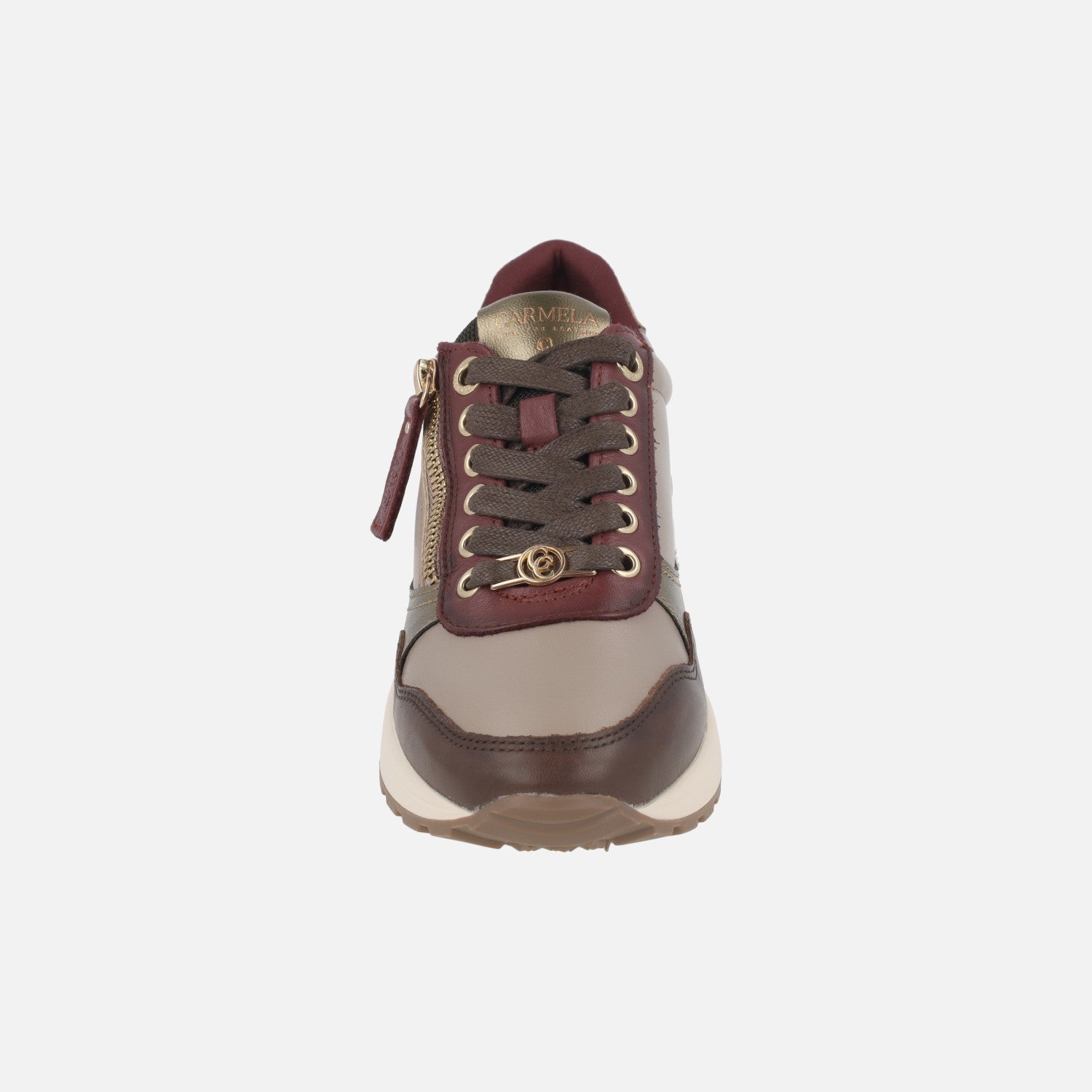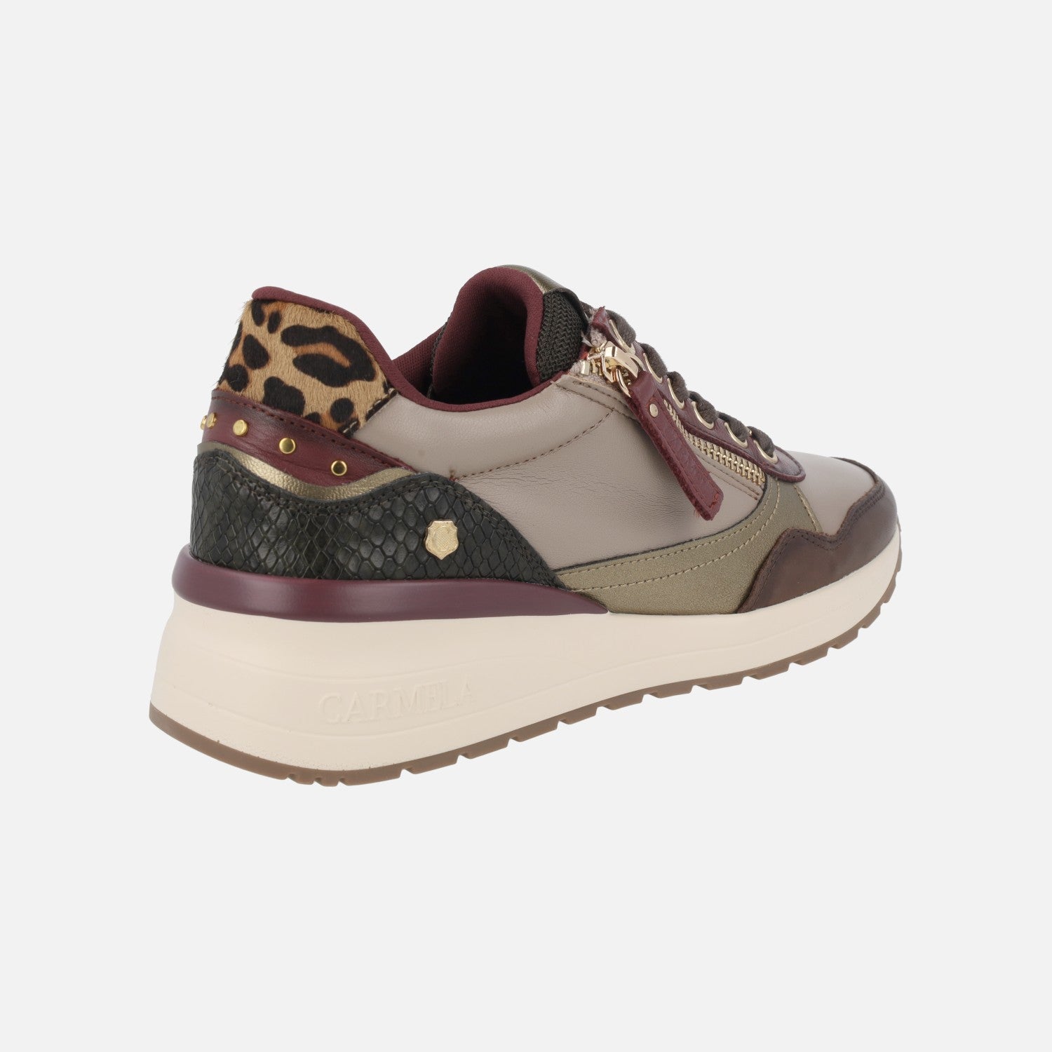 Zapatos deportivos de piel de la marca Carmela, modelo 162442 disponibles en 5 combinaciones de color: burdeos, camel, beige, kaki y negro. Deportivas con exterior en piel, cierre de cordones y además cremallera lateral. Detalle de animal print leopardo en el talón. Interior textil con plantillas extraíbles forradas de piel. Piso sintético, con ligera cuña de 5 cm de altura en la parte trasera (2 cm en la parte delantera).