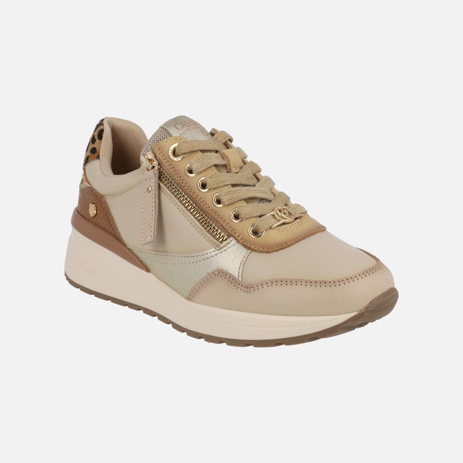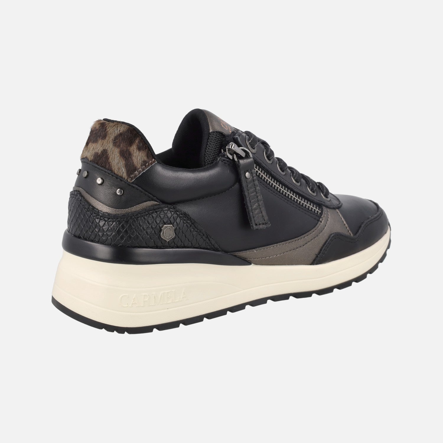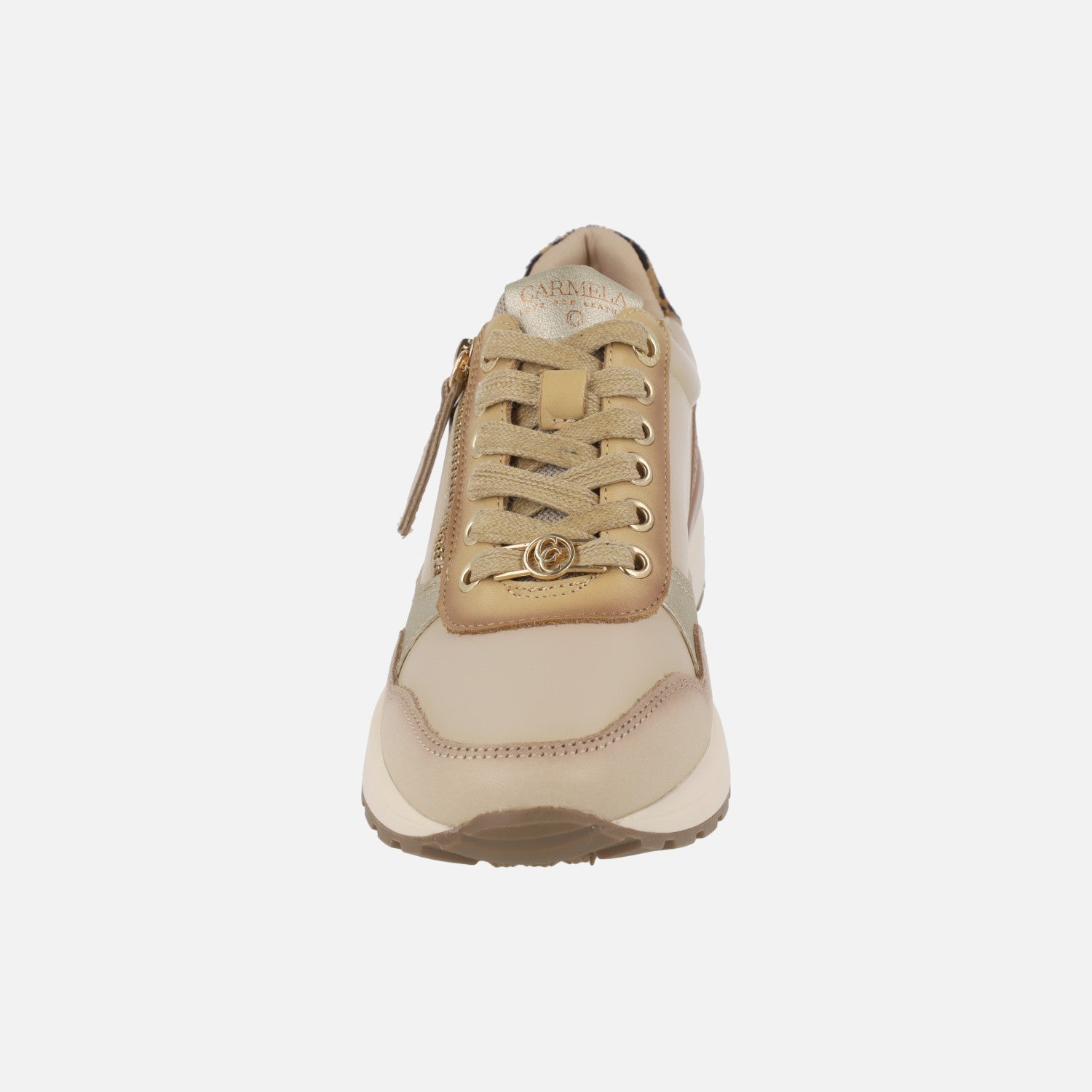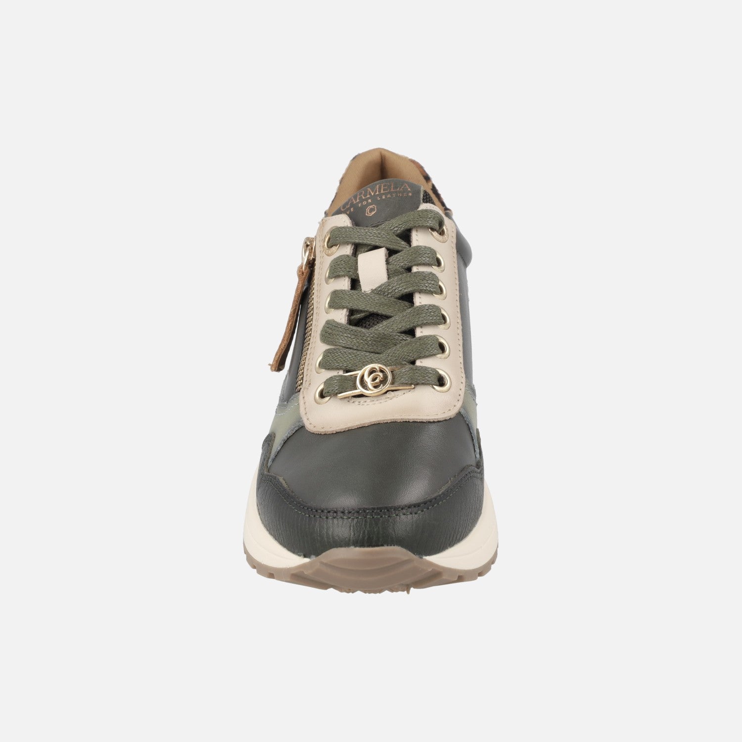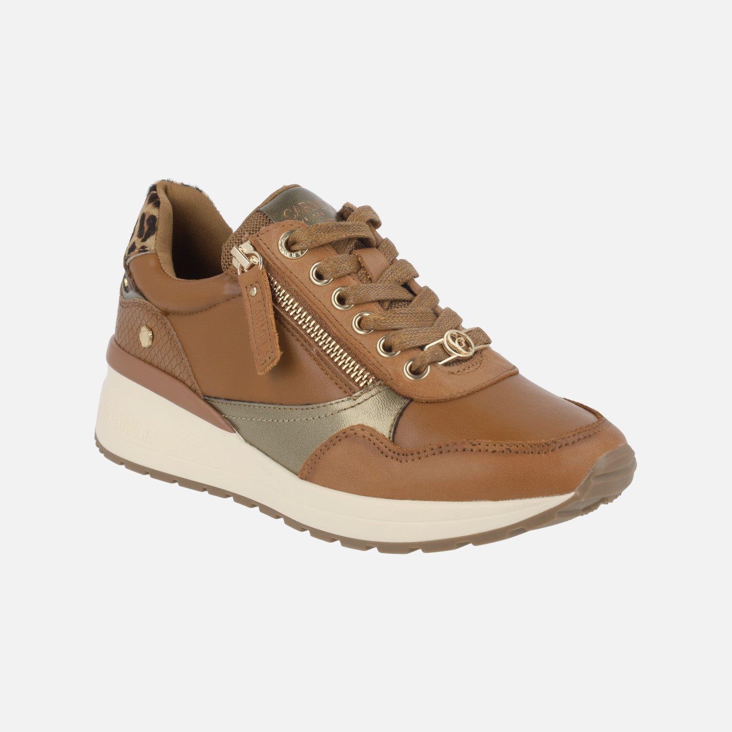 Zapatos deportivos de piel de la marca Carmela, modelo 162442 disponibles en 5 combinaciones de color: burdeos, camel, beige, kaki y negro. Deportivas con exterior en piel, cierre de cordones y además cremallera lateral. Detalle de animal print leopardo en el talón. Interior textil con plantillas extraíbles forradas de piel. Piso sintético, con ligera cuña de 5 cm de altura en la parte trasera (2 cm en la parte delantera).