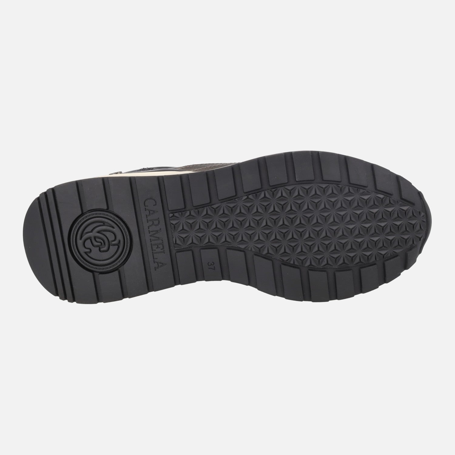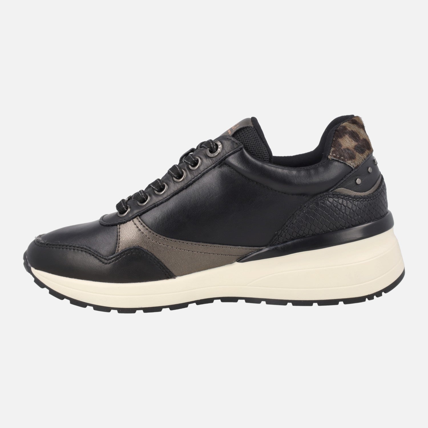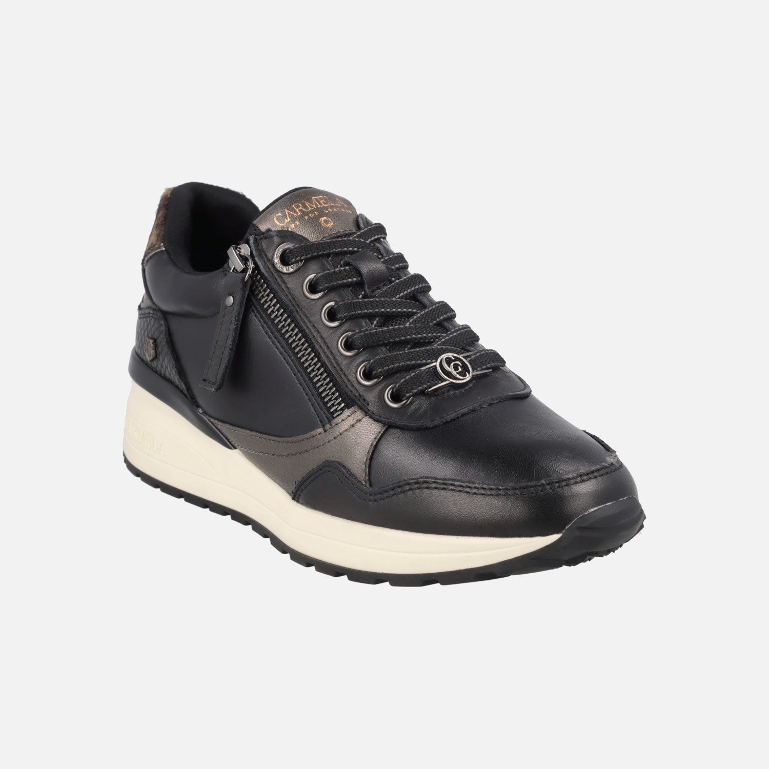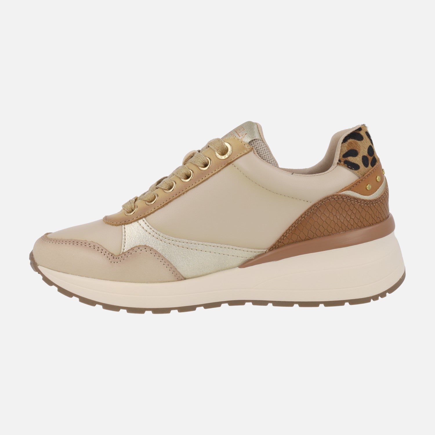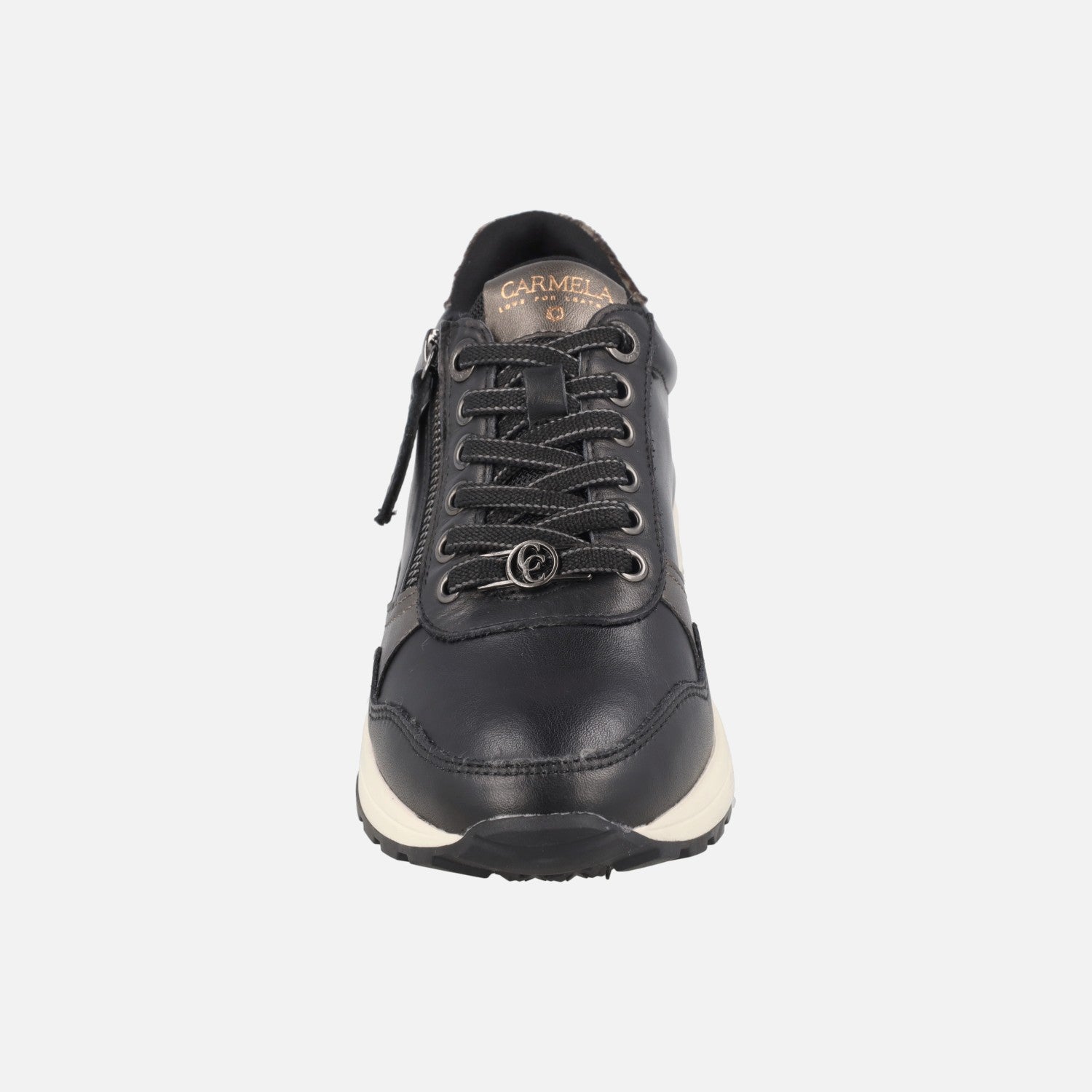 Zapatos deportivos de piel de la marca Carmela, modelo 162442 disponibles en 5 combinaciones de color: burdeos, camel, beige, kaki y negro. Deportivas con exterior en piel, cierre de cordones y además cremallera lateral. Detalle de animal print leopardo en el talón. Interior textil con plantillas extraíbles forradas de piel. Piso sintético, con ligera cuña de 5 cm de altura en la parte trasera (2 cm en la parte delantera).