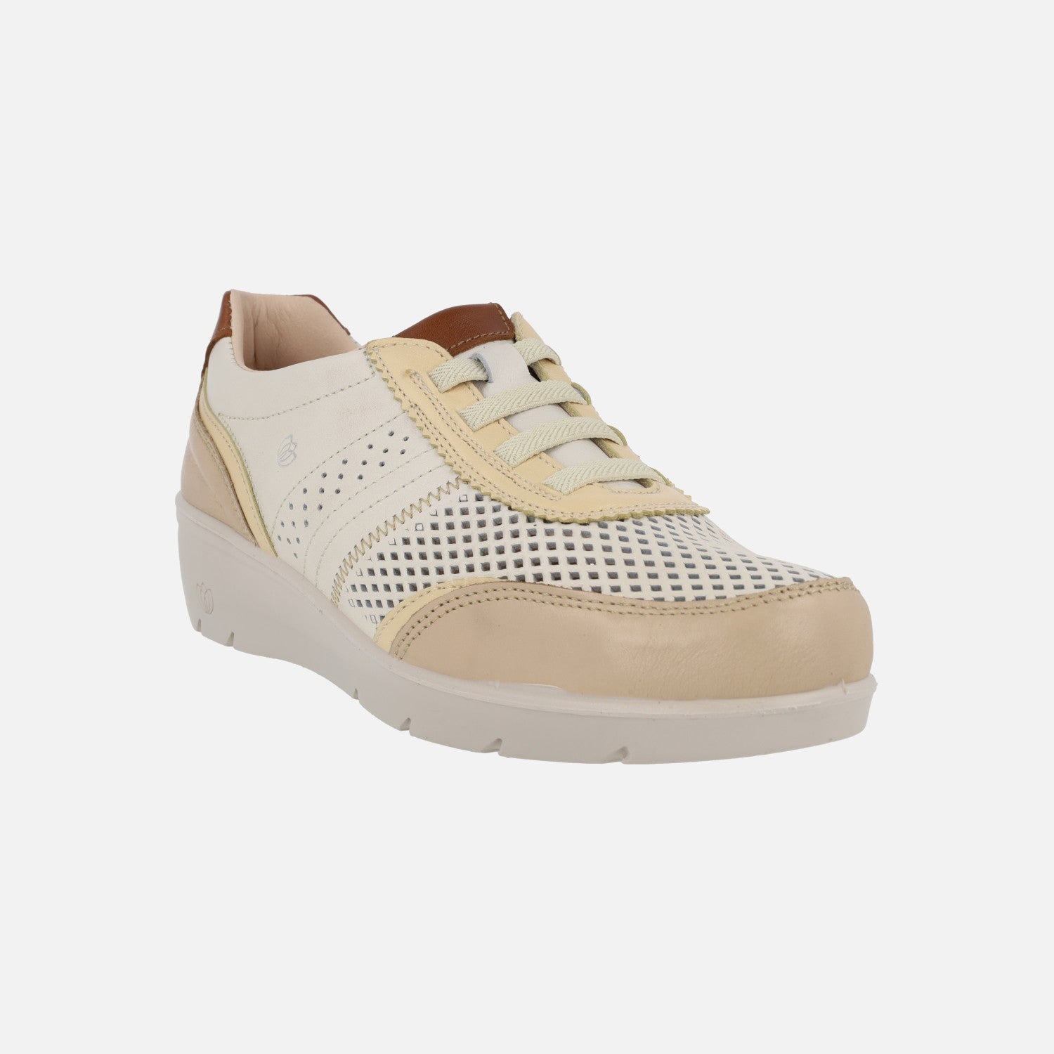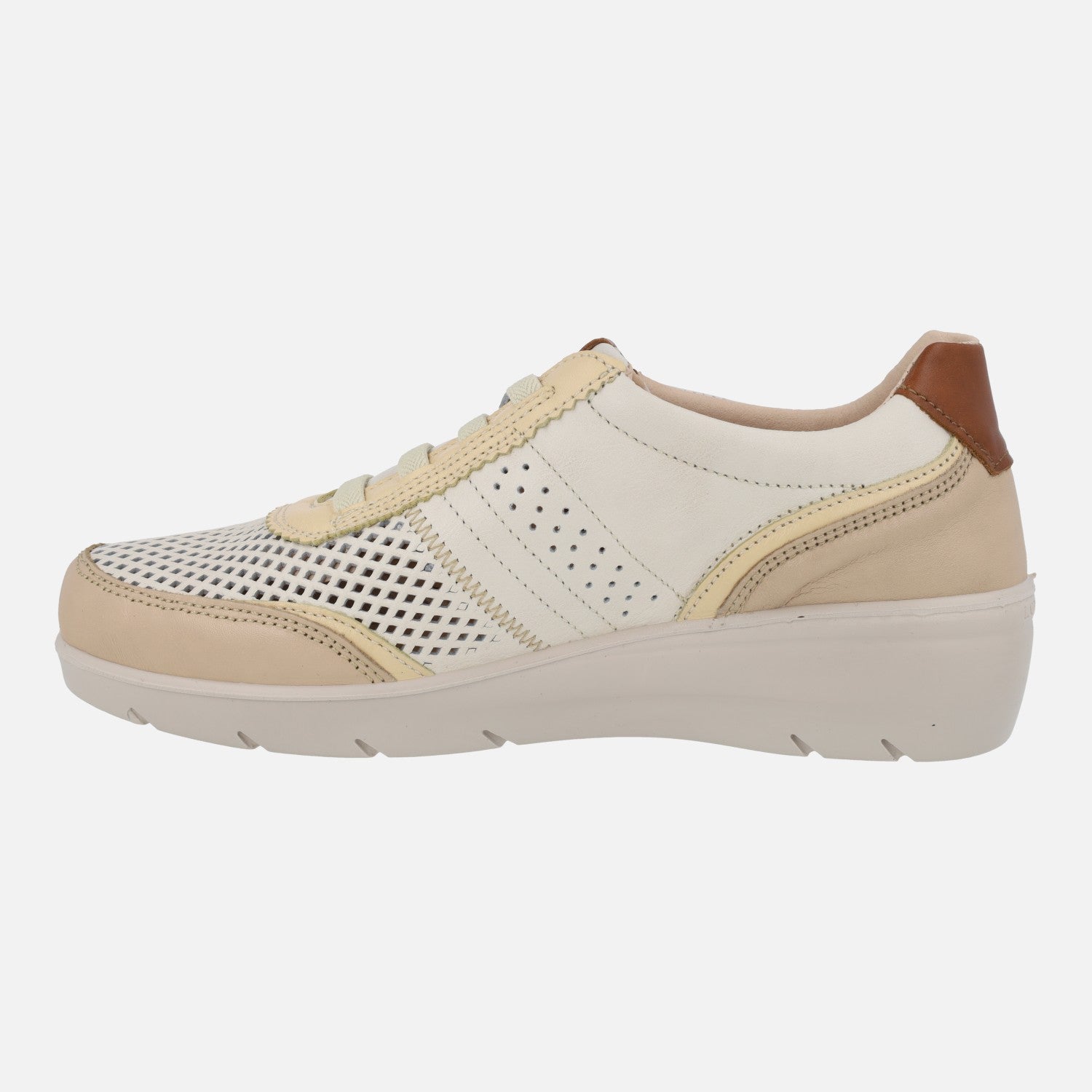 Zapatillas deportivas confort para mujer de la marca Laura Azaña modelo LA26842BI Combi Beige. Deportivas de piel con fondo en beige claro con detalle de picados. Piezas contrastadas en  marrón, vainilla y beige. Cierre de cordones elásticos. Interior textil, plantillas extraíbles. Suela sintética con 4 cm de altura trasera (2 cm parte delantera). Made in SPain.