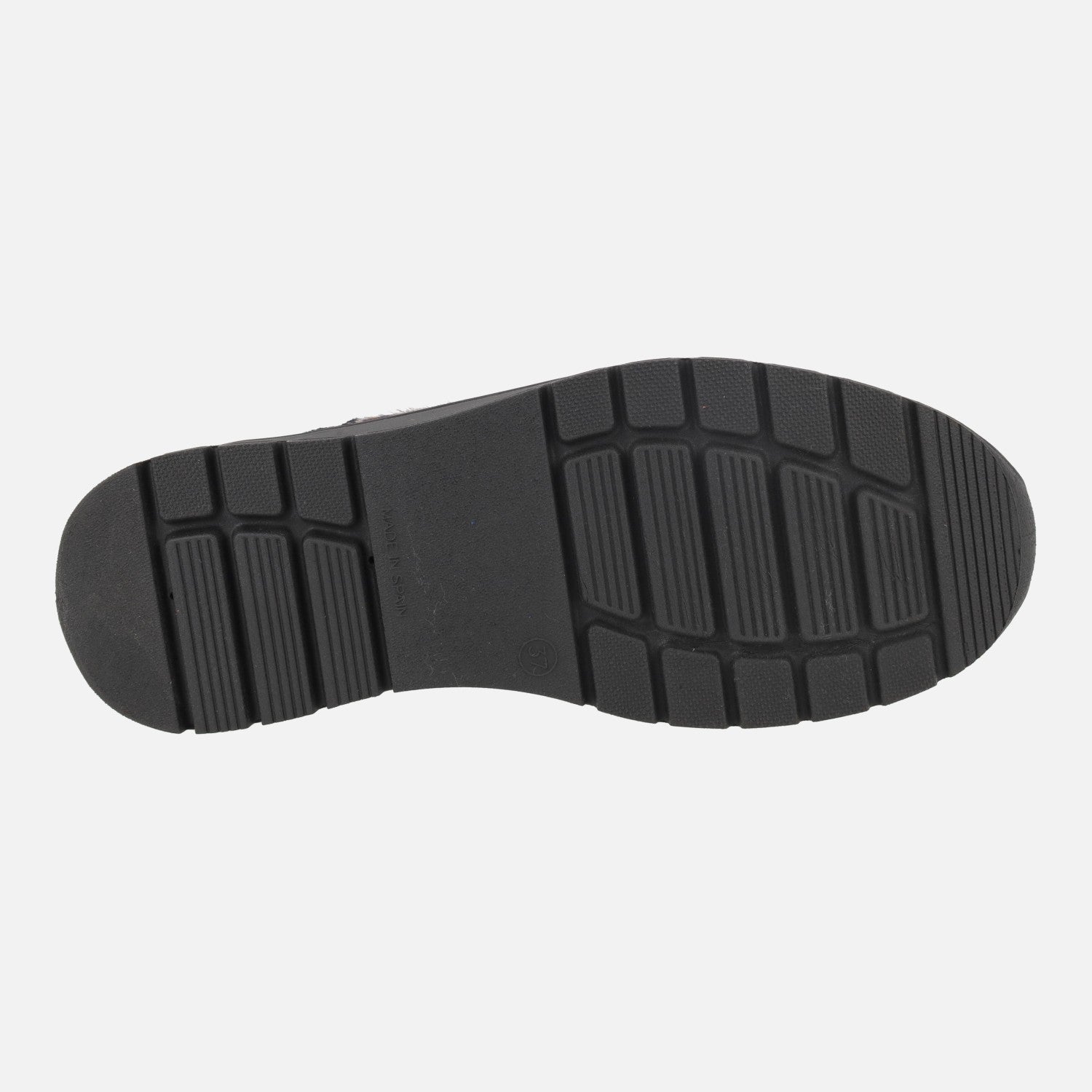 Zapatos deportivos para mujer de la marca Roal modelo A40026 Negro y beige. Deportivos elaborados en combinado de pieles y tejido, con cierre de cordones y además cremallera lateral. Combinados con pelo print leopardo en ambos lados. Interior textil con plantillas extraíbles. Piso sintético con 4 cm de altura trasera y 2,5 cm en la parte delantera. Made in Spain.