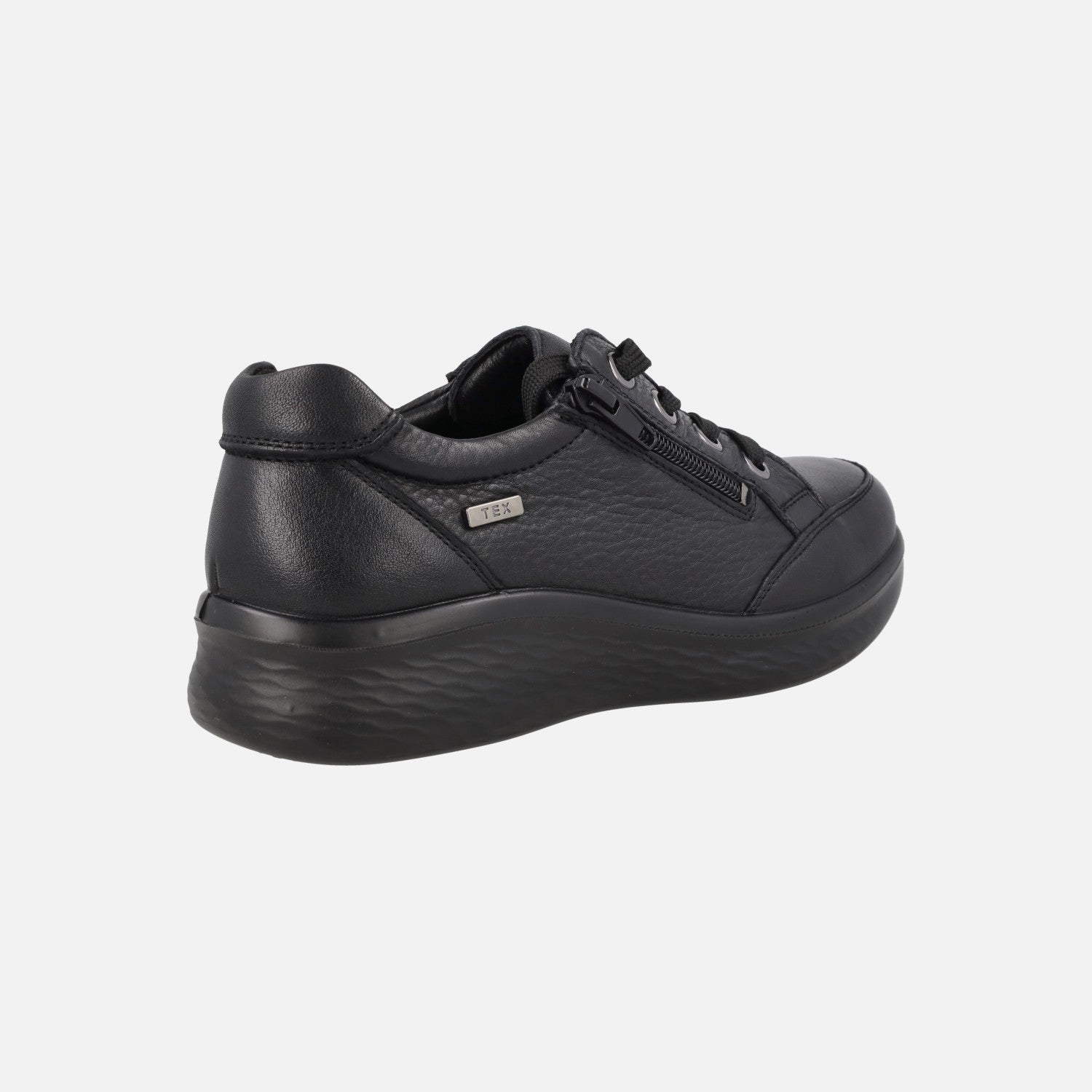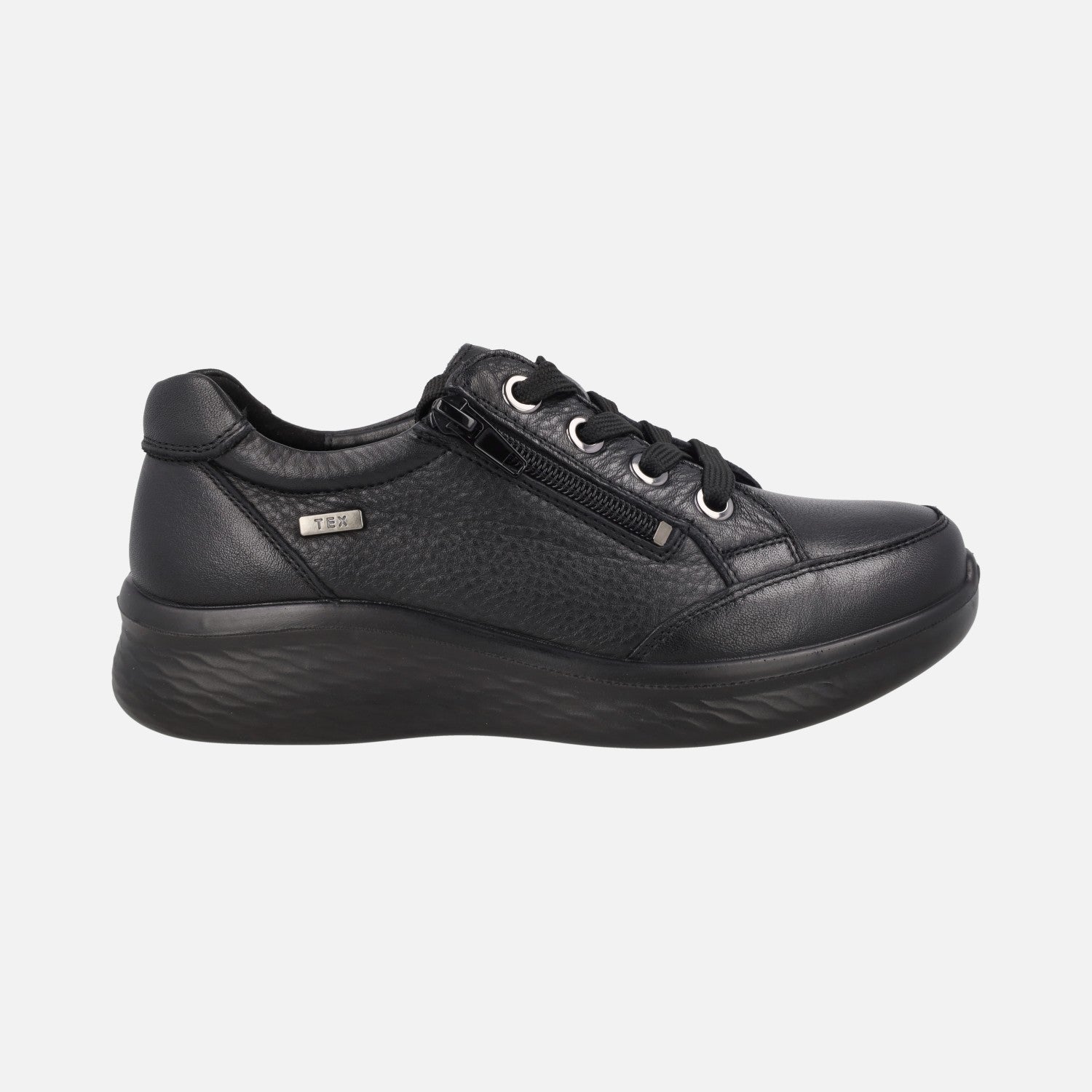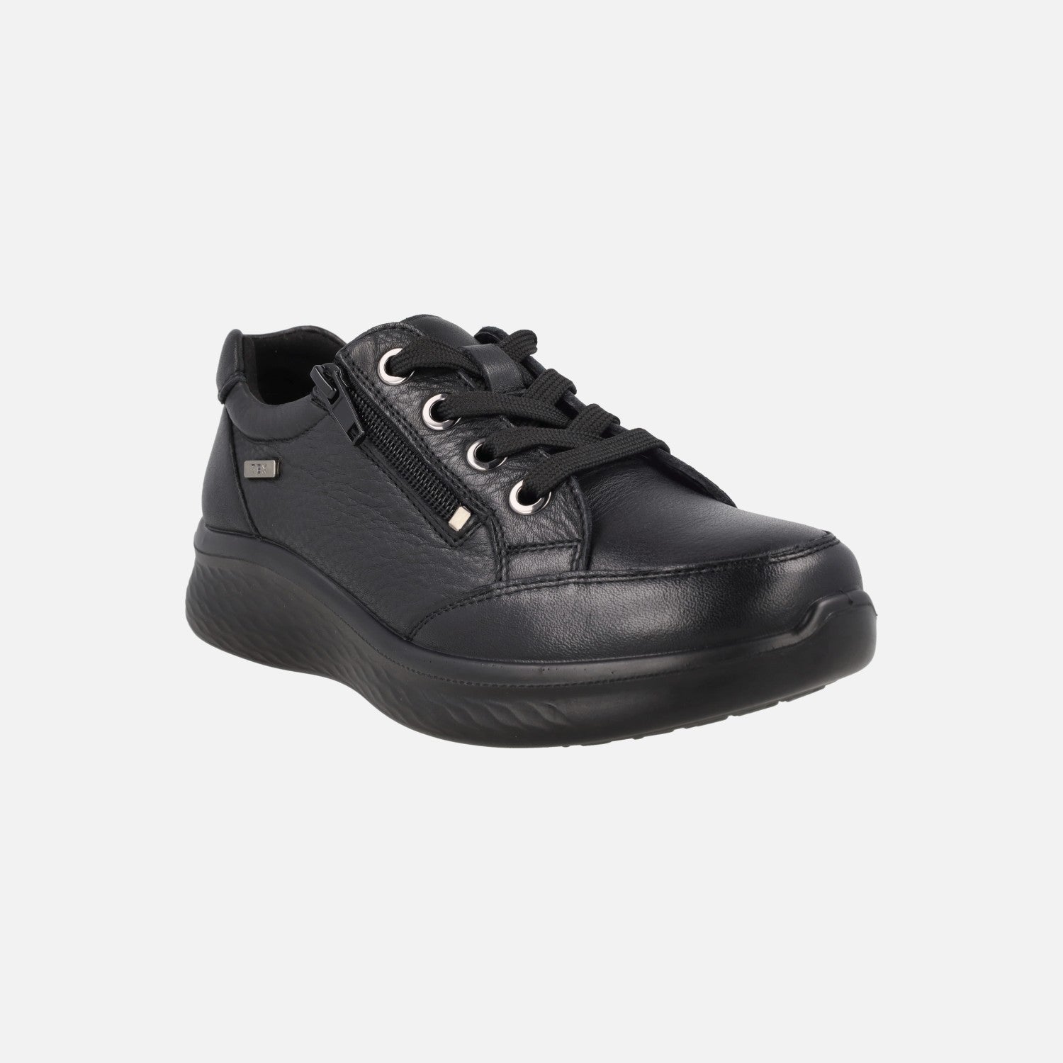 Zapatos deportivos para mujer de la marca G Comfort modelo P-811-S Black. Deportivos confort, de calce ancho, elaborados en piel negra con cierre de cordones y además cremallera lateral para faciliar el calce. Membrana interior impermeable TEX. Forro textil, plantillas extraíbles de piel. Piso sintético con 3,5 cm de cuña trasera (2 cm parte delantera).