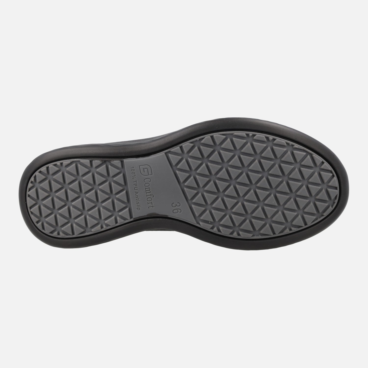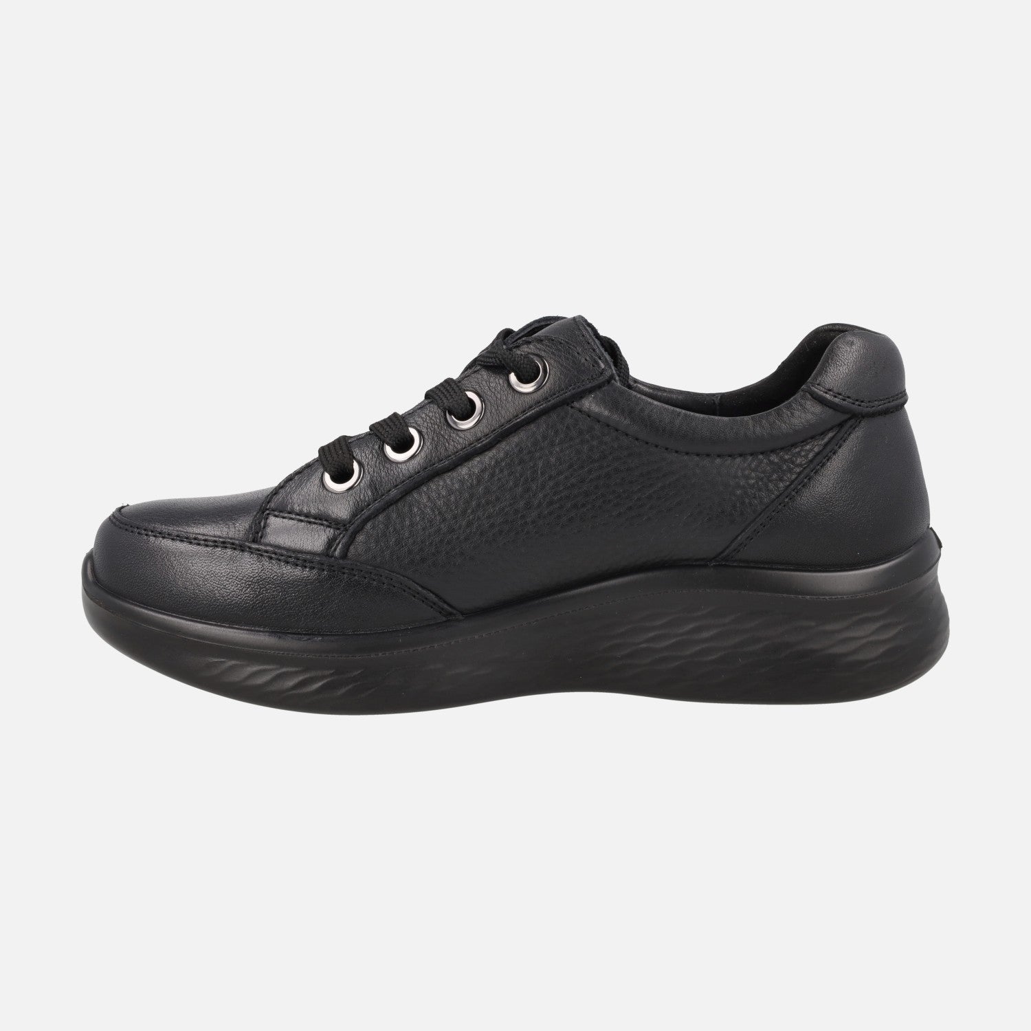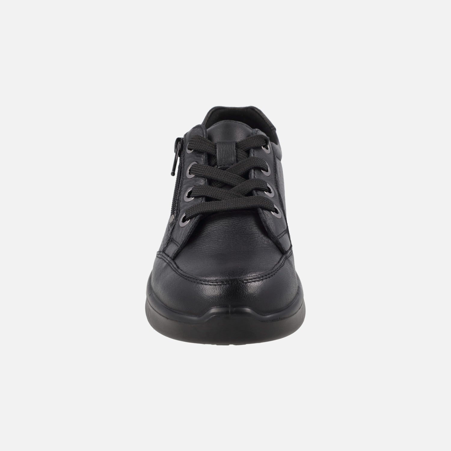 Zapatos deportivos para mujer de la marca G Comfort modelo P-811-S Black. Deportivos confort, de calce ancho, elaborados en piel negra con cierre de cordones y además cremallera lateral para faciliar el calce. Membrana interior impermeable TEX. Forro textil, plantillas extraíbles de piel. Piso sintético con 3,5 cm de cuña trasera (2 cm parte delantera).