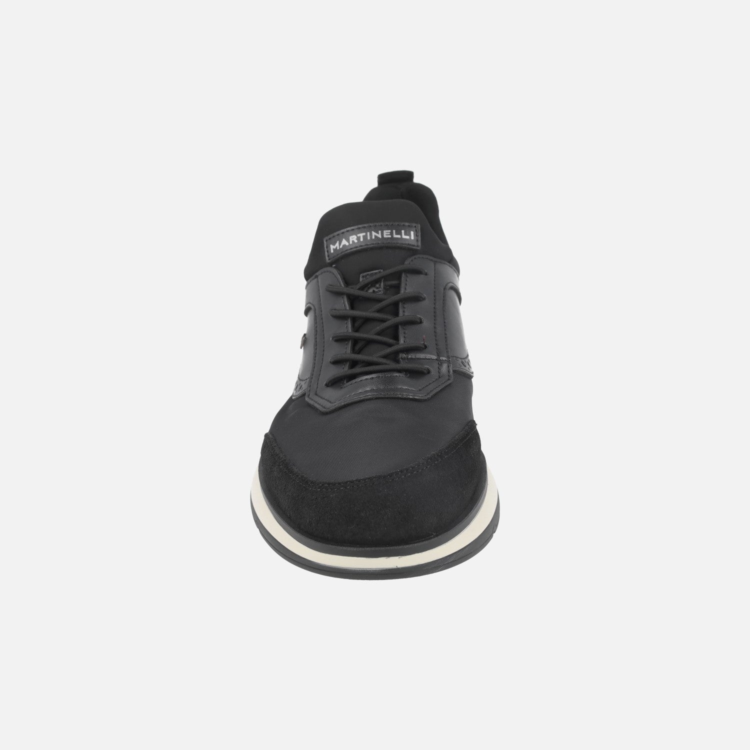 Elegantes zapatos deportivos para hombre de la marca Martinelli, modelo Walden 1606-2733X Black. Sneakers para hombre elaboradas en combinado de piel lisa, serraje y tejido, con cordones elásticos. Interior mixto en tejido y otros materiales. Suela sintética bicolor.