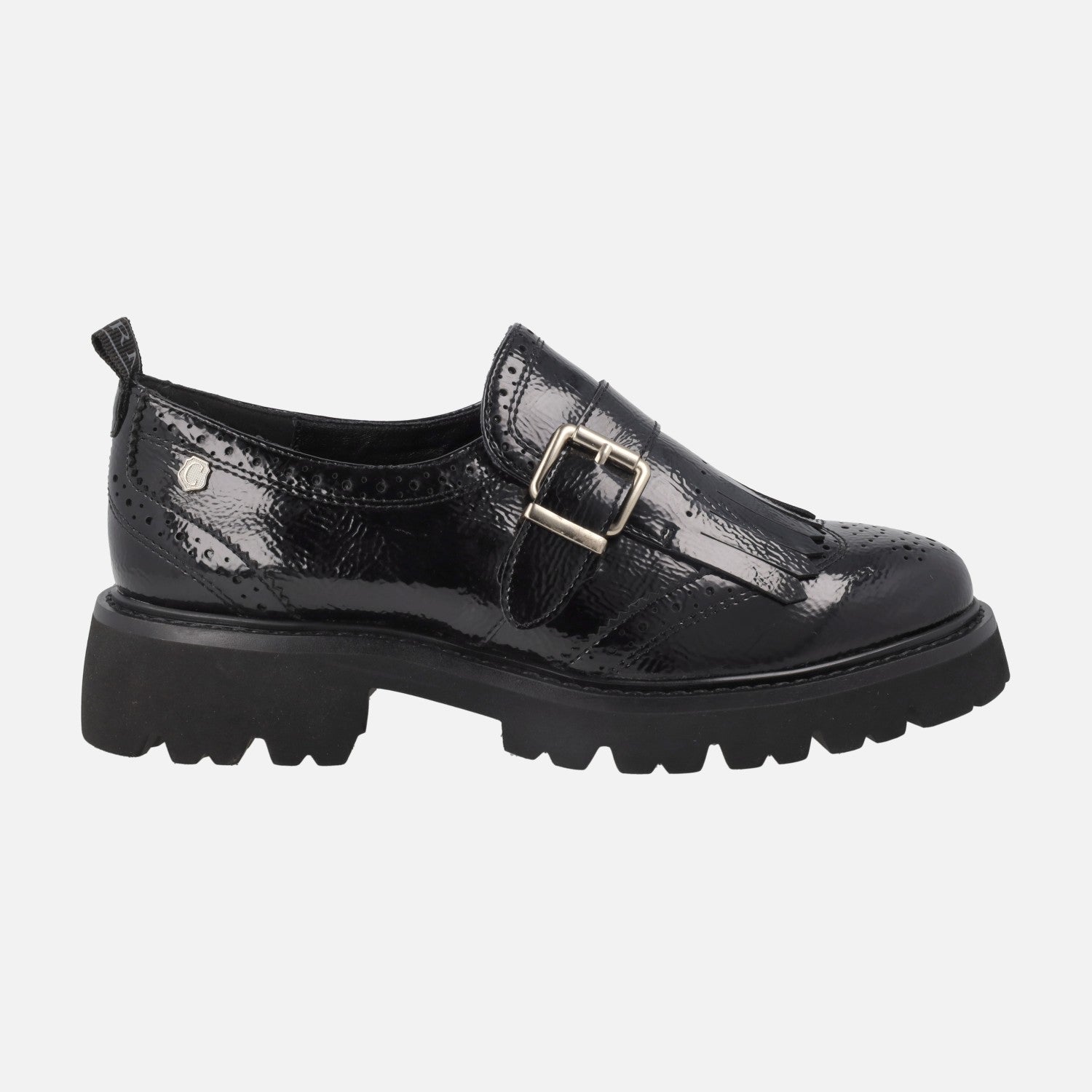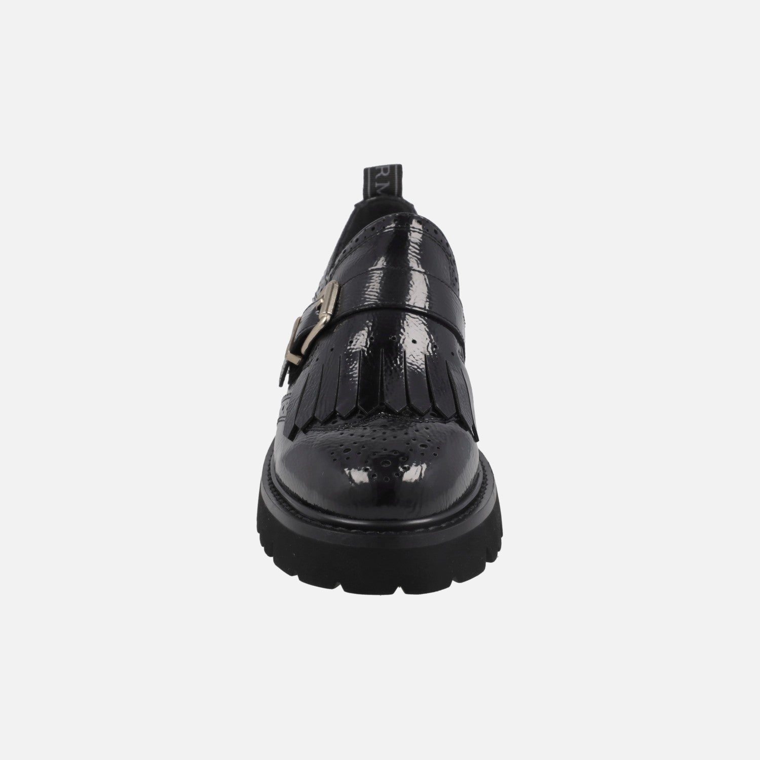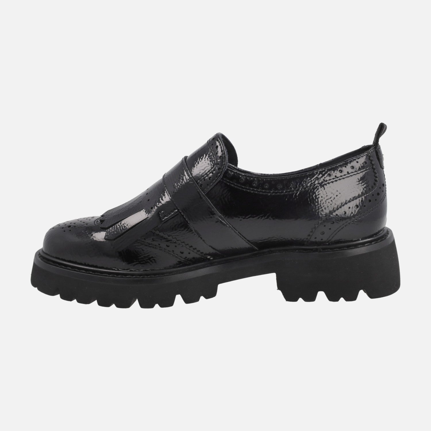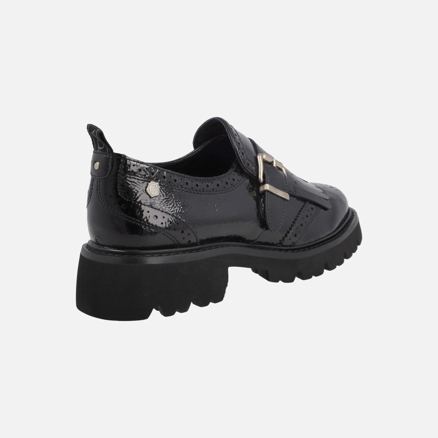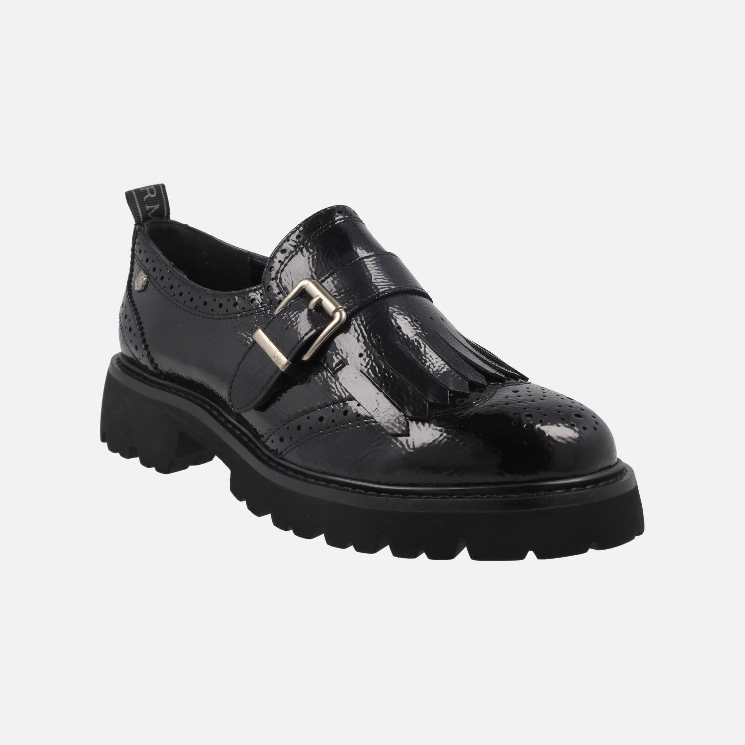Zapatos mocasines de charol de la marca Carmela, modelo 162594 charol negro. Zapatos de estilo masculino, con copete de flecos y hebilla dorada. Elaborados en materiales sintéticos, acabado charol, negros. Interior textil con plantillas forradas de piel. Piso track, de 4 cm de altura trasera (2 cm parte delantera).