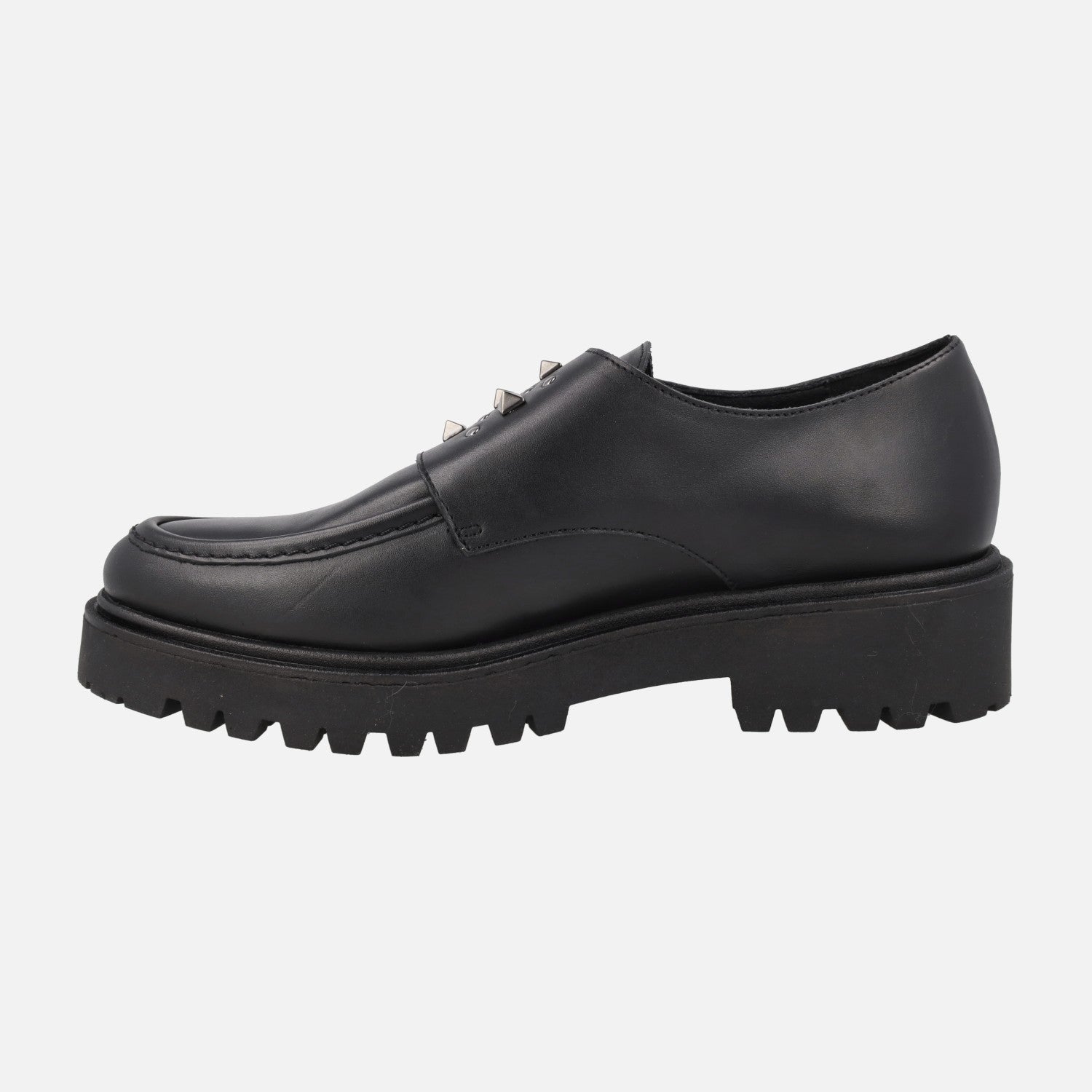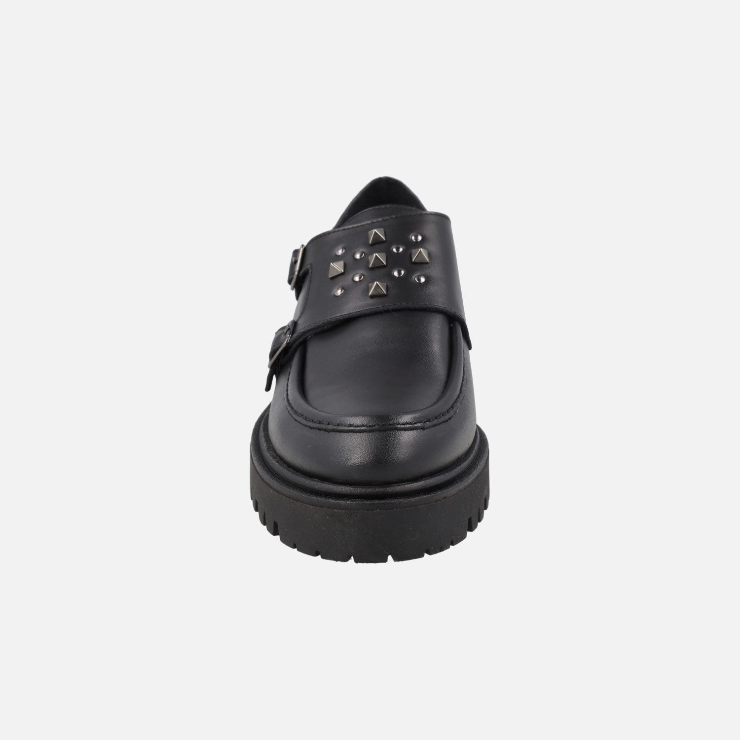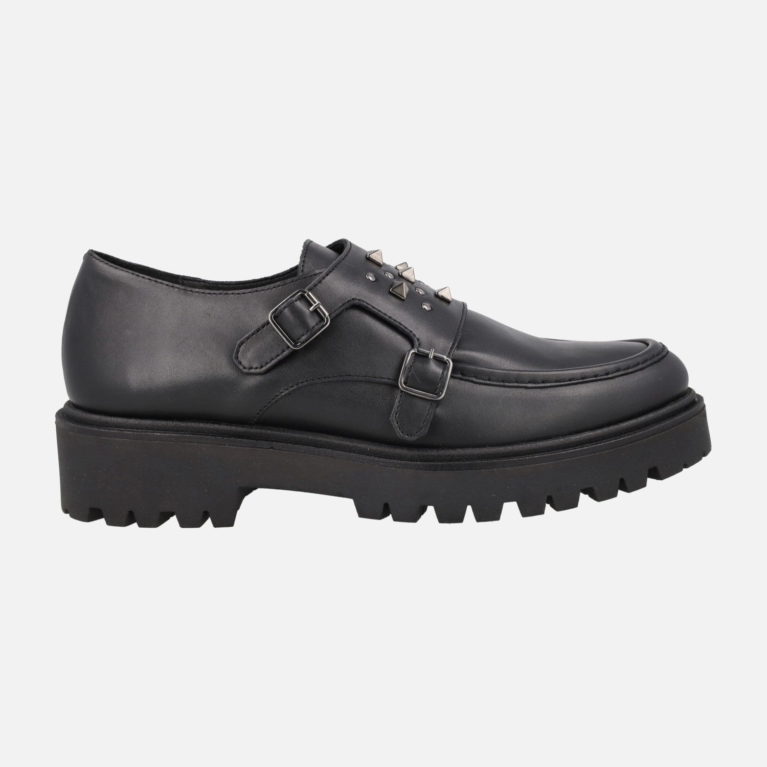 Preciosos zapatos con hebillas de la nueva colección de Bryan, modelo 4338 Negro. Zapatos de inspiración masculina, elaborados en piel negra, con solapa que cruza el empeine y cierra con hebillas, además lleva adorno de tachas metálicas. Interior mixto en piel y tejido, plantillas forradas de piel. Piso estilo track, con 4 cm de altura trasera (2 cm parte delantera).