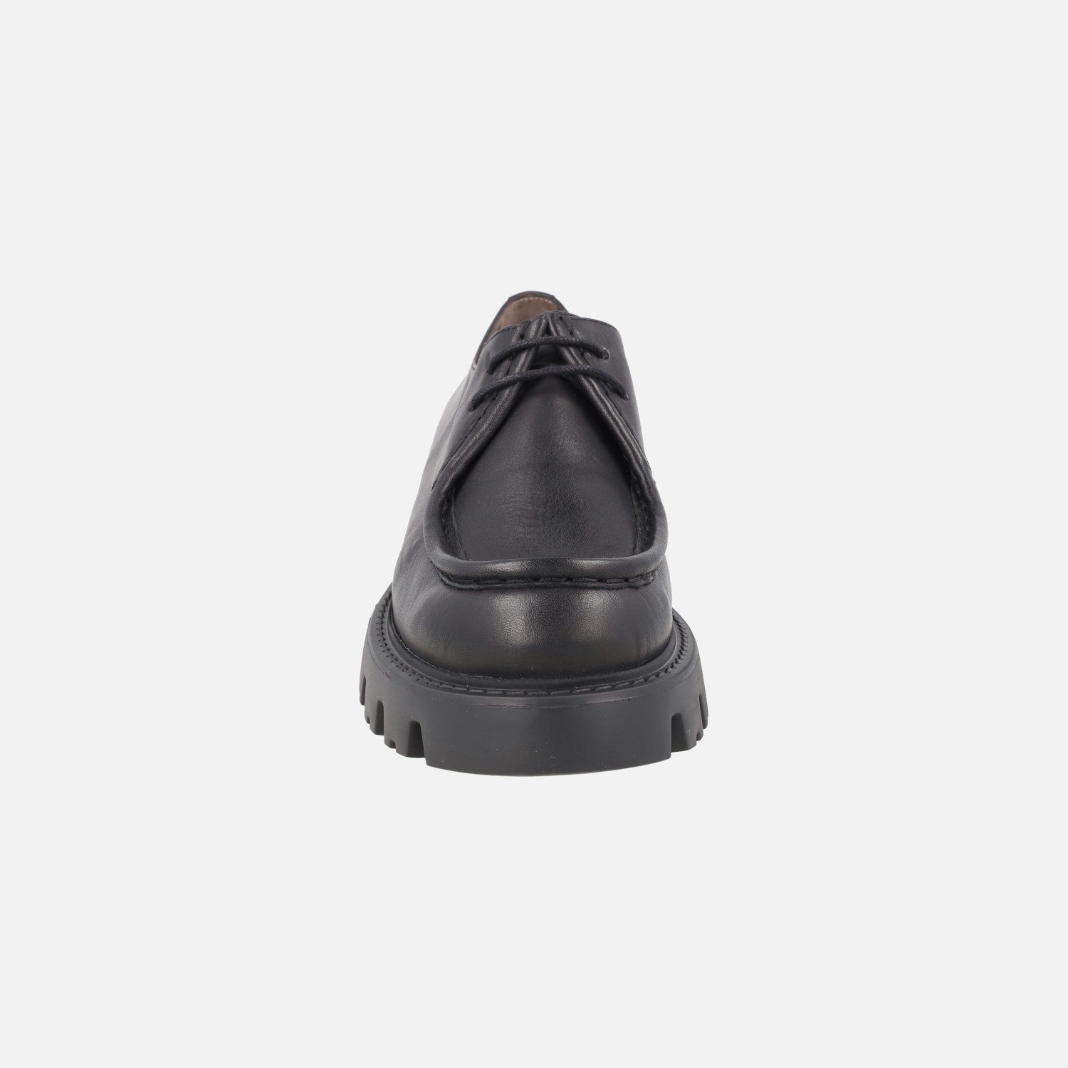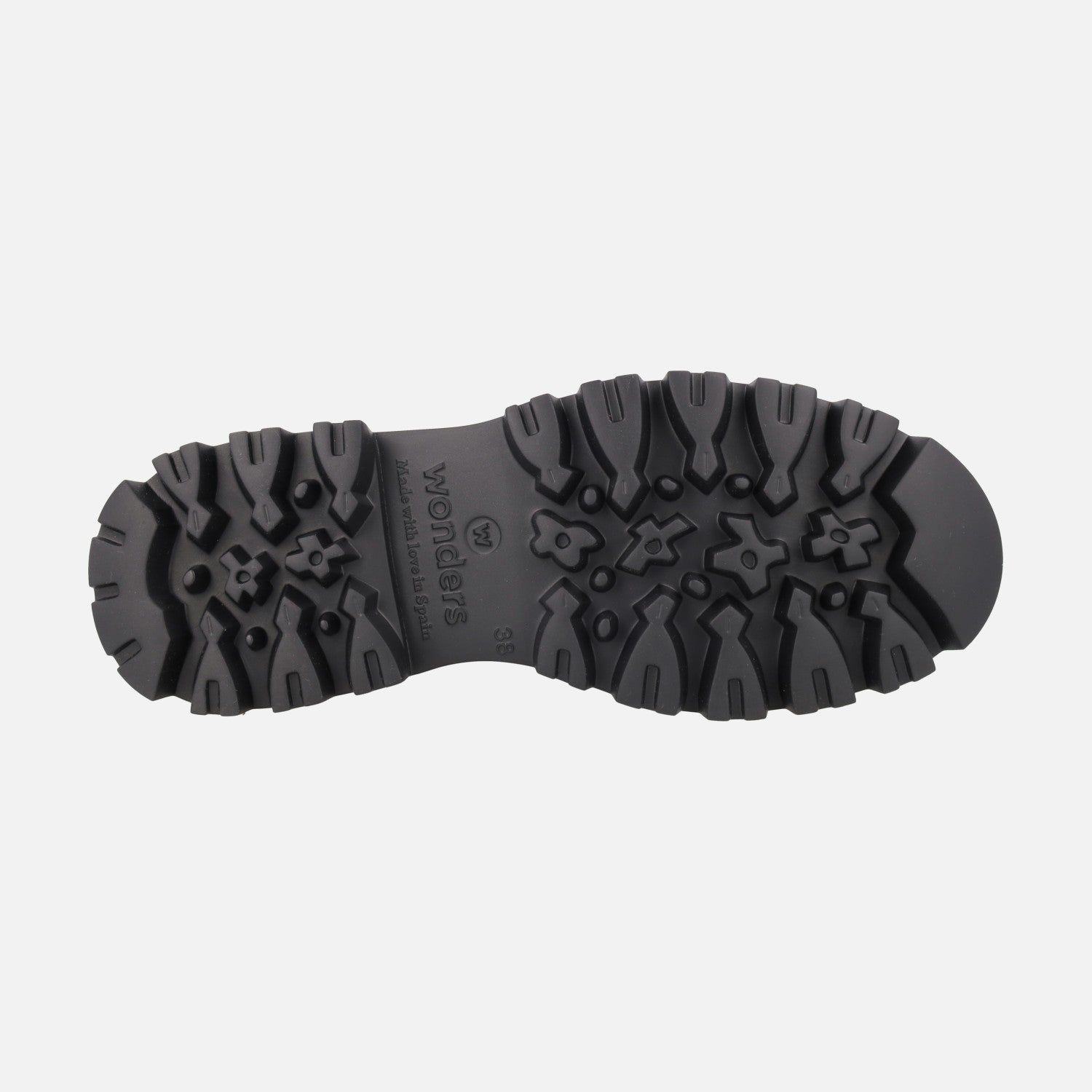 Zapatos de cordones estilo wallabee de la marca Wonders modelo C-7514 Goodfly 14. Zapatos elaborados en piel negra, con interior mixto de piel y tejido. Piso de EVA estilo track, con 4 cm de tacón (2,5 cm de plataforma delantera). Tecnología FLYGRIP para un gran agarre a la vez de tener una máxima ligereza.