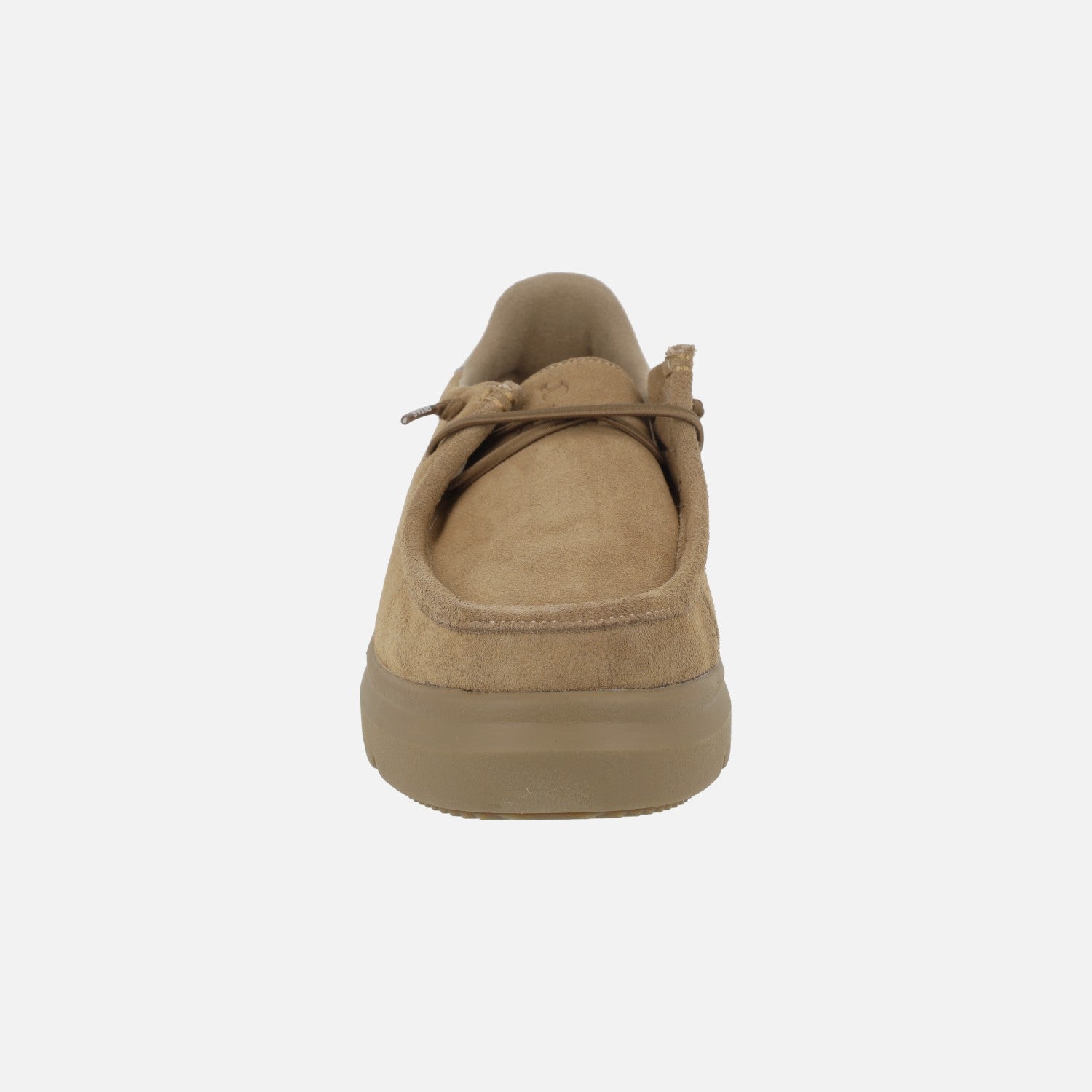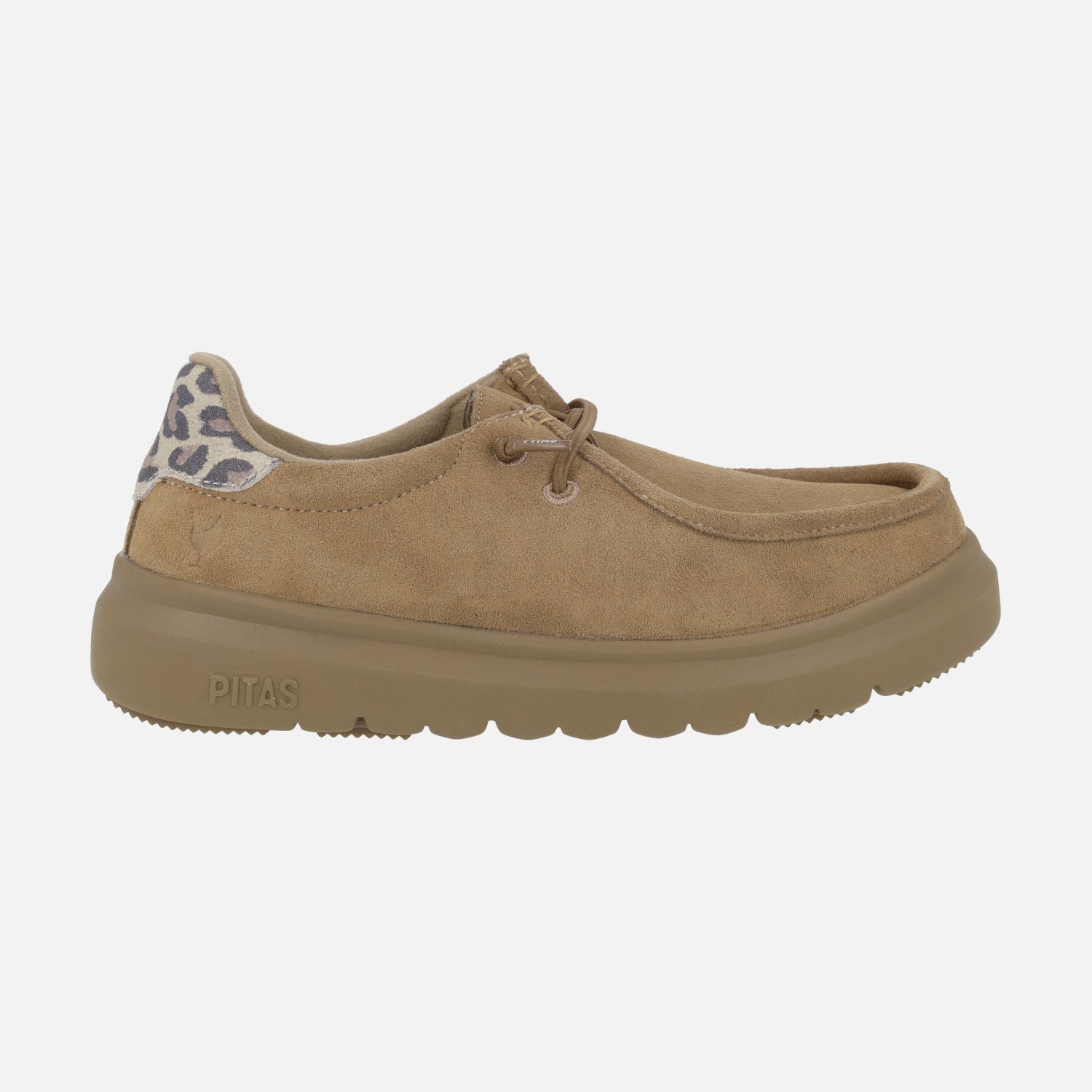 Zapatos estilo wallabi de la marca Walk in pitas, modelo Lyon. Zapatos elaborados en serraje hidrofugado repelente al agua, con cordones elásticos. Interior textil, con plantillas extraíbles de EVA forradas de piel. Piso de EVA Ultralight, con 4 cm de altura trasera (2,5 cm parte delantera). Disponibles en camel y en tortola (gris). Detalle de animal print leopardo en el talón.