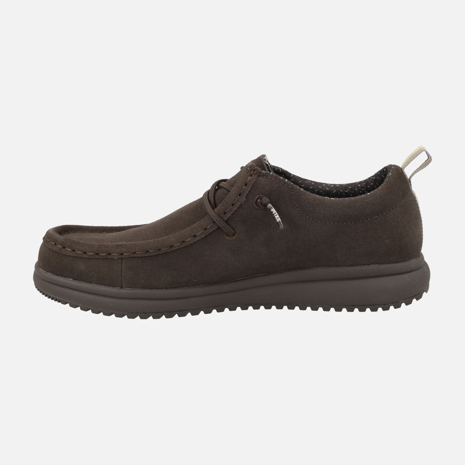 Zapatos de cordones estilo wallabi para hombre modelo Texas de la marca Walk in pitas. Zapatos elaborados en serraje hidrofugado, con tirador textil y cordones elásticos. Interior textil con plantillas extraíbles forradas de piel. Disponibles en marrón oscuro y en color tórtola. Piso de EVA Ultralight.