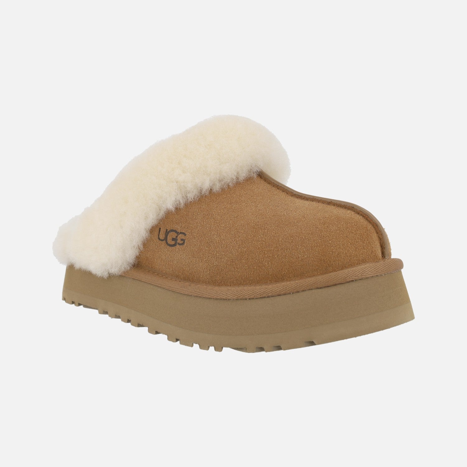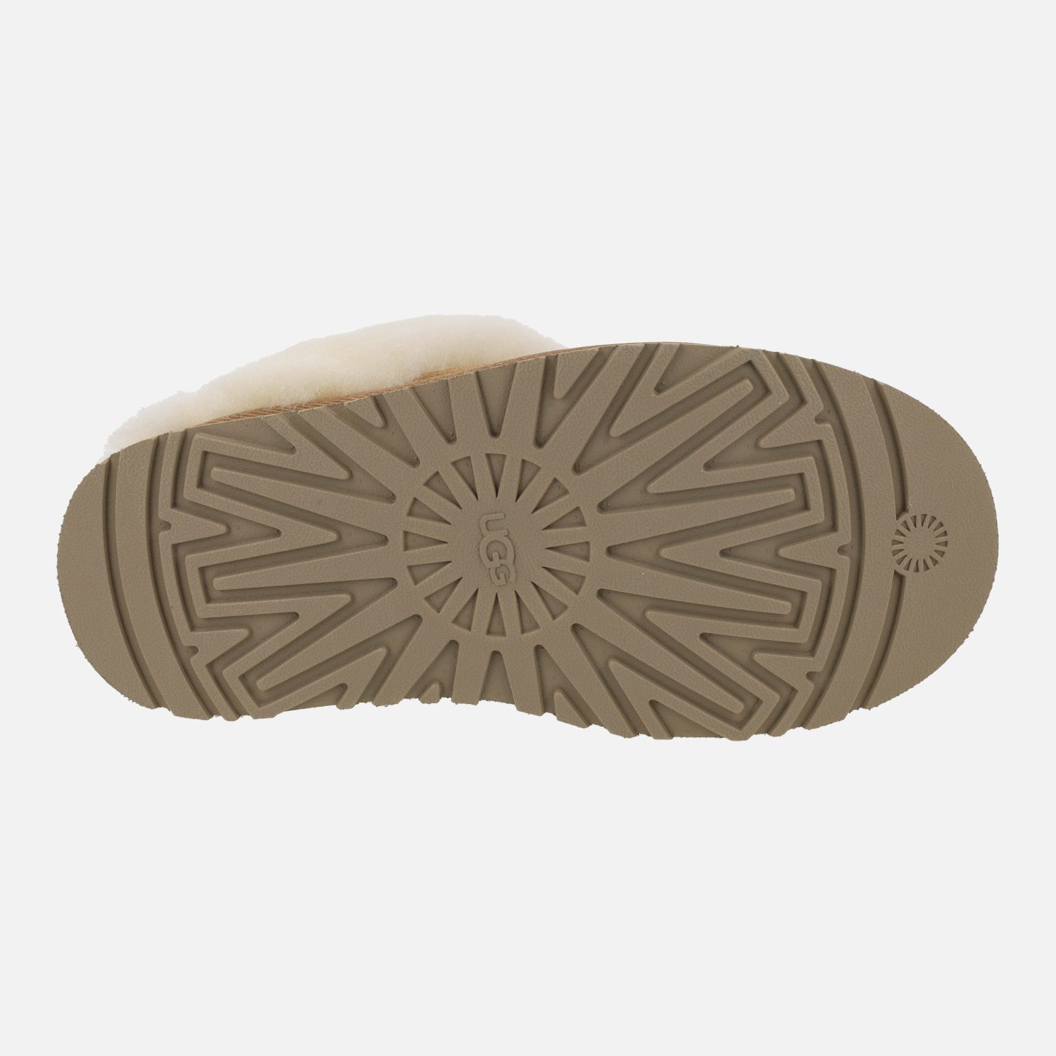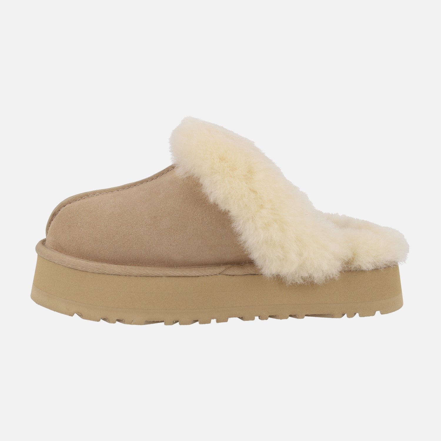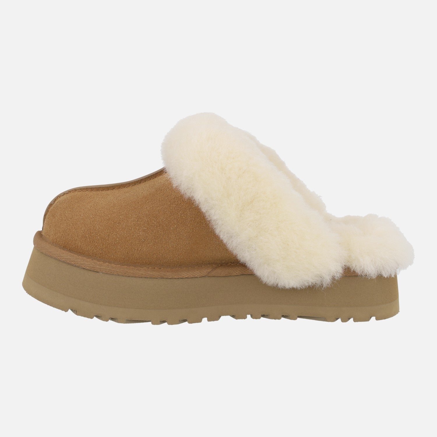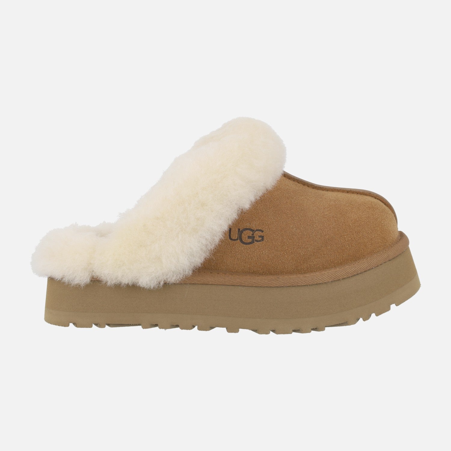 Zuecos UGG Disquette 1122550 disponibles en chesnut (camel) o sand (beige). Zuecos con pala de ante y pelo de oveja natural. Interior forrado de pelo de oveja. Ribete textil. Plataforma de EVA de 3,5 cm de altura.