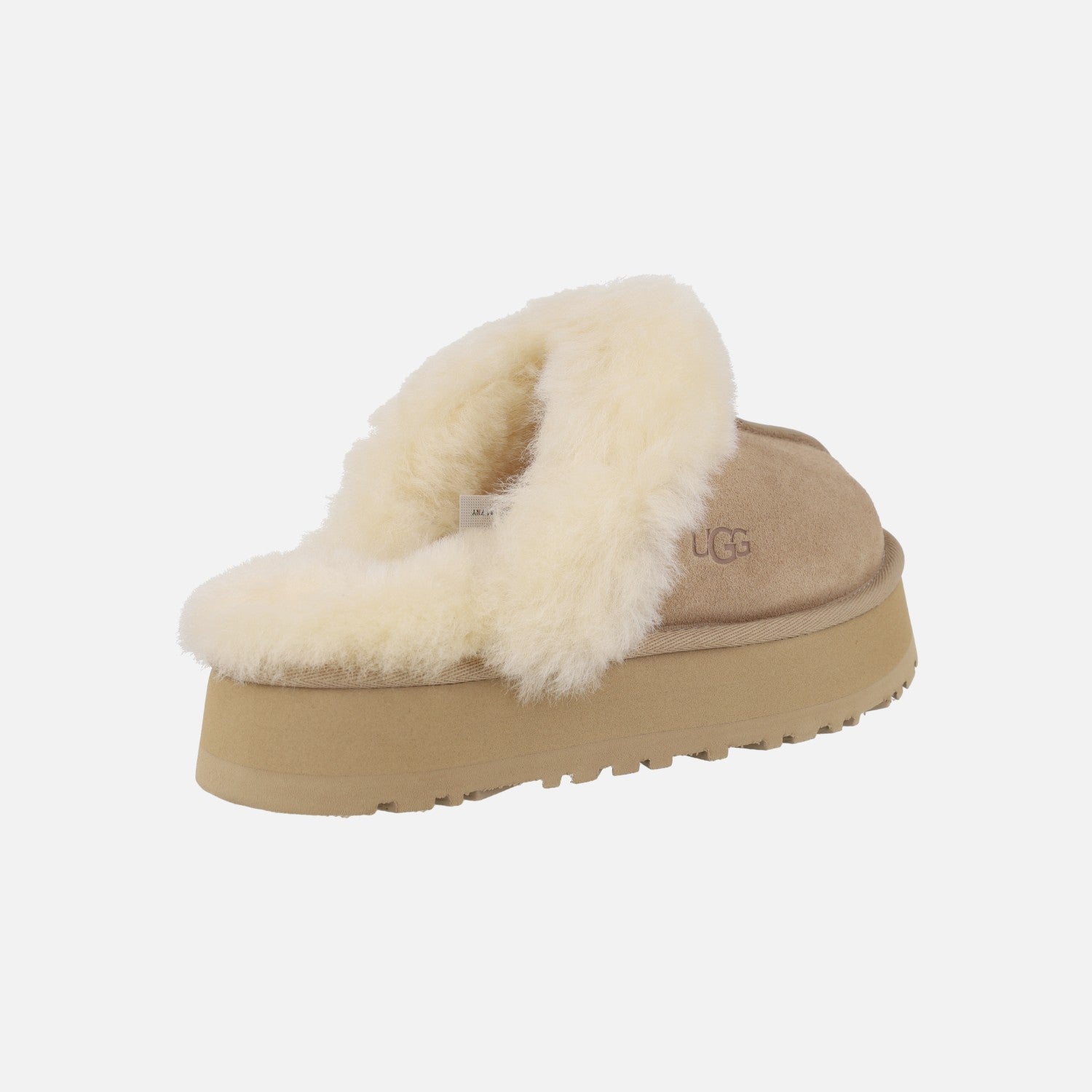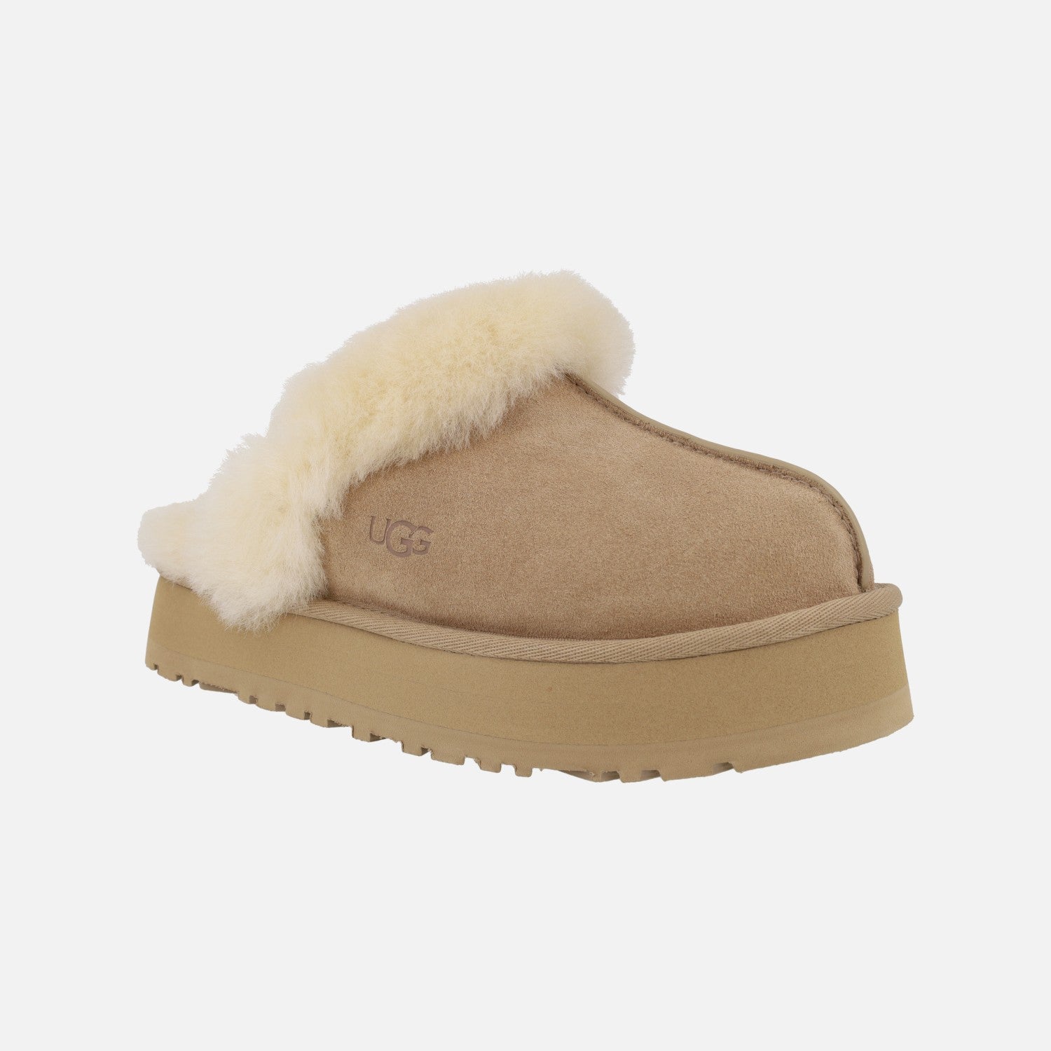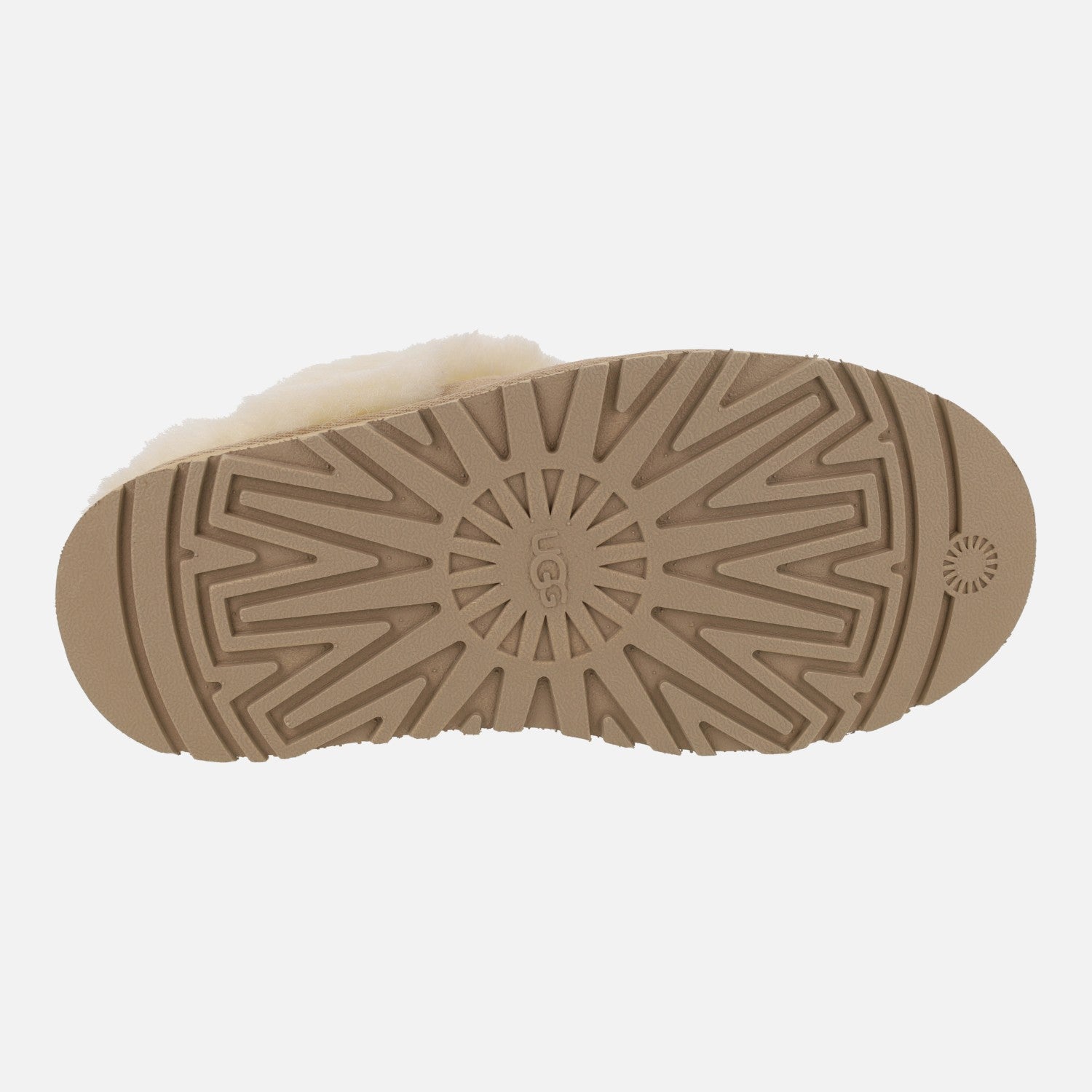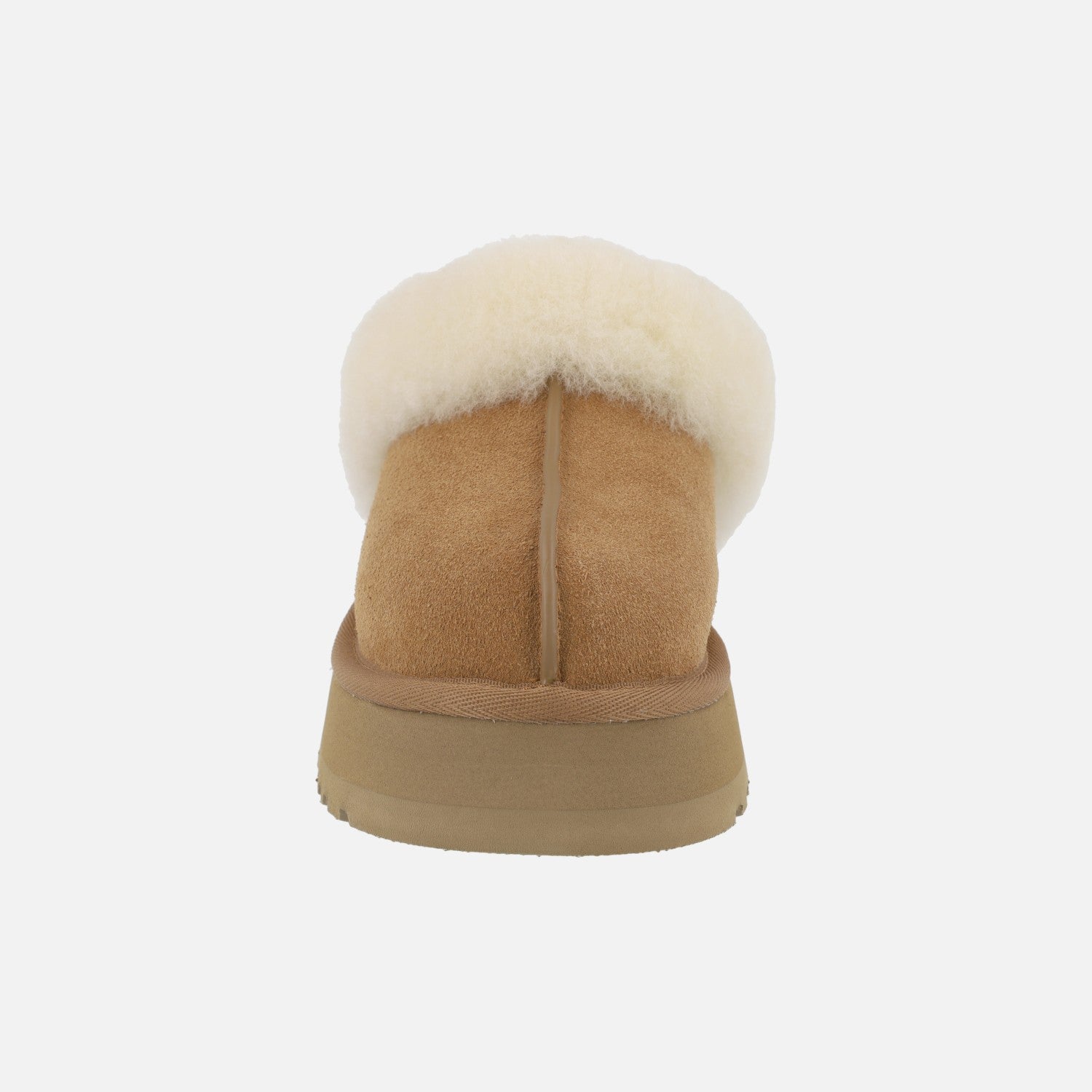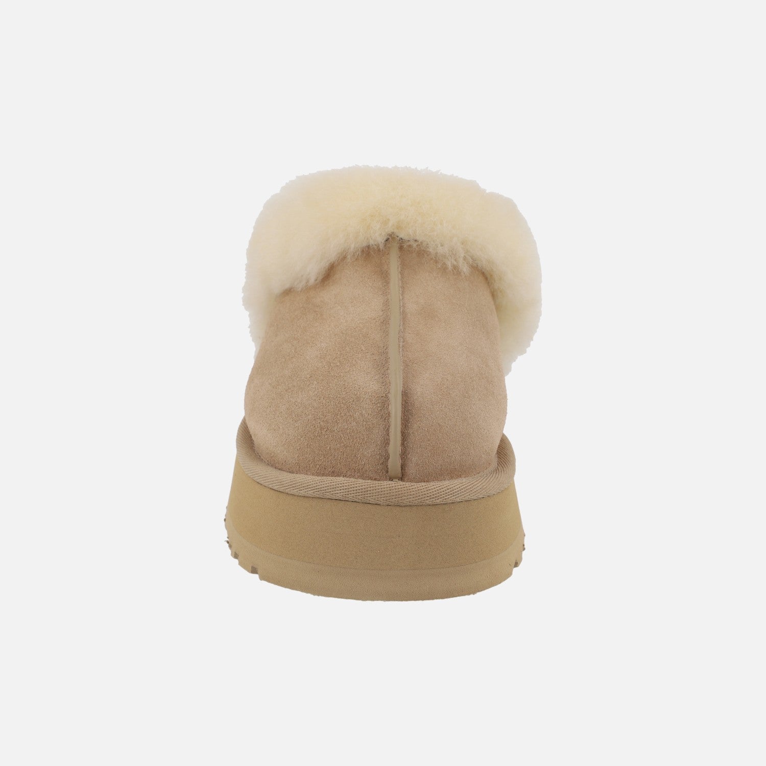 Zuecos UGG Disquette 1122550 disponibles en chesnut (camel) o sand (beige). Zuecos con pala de ante y pelo de oveja natural. Interior forrado de pelo de oveja. Ribete textil. Plataforma de EVA de 3,5 cm de altura.