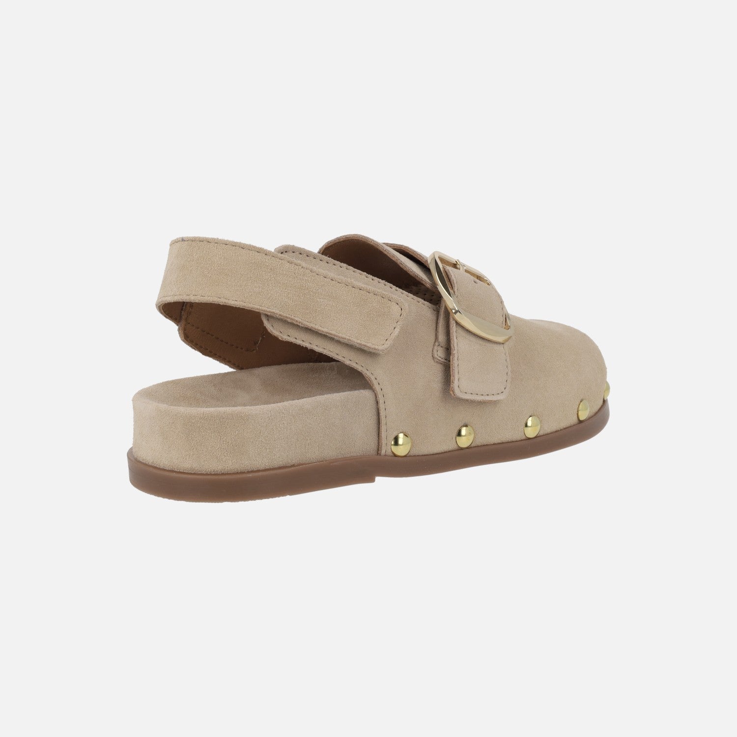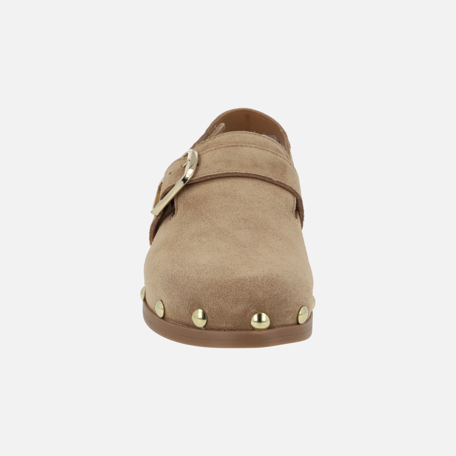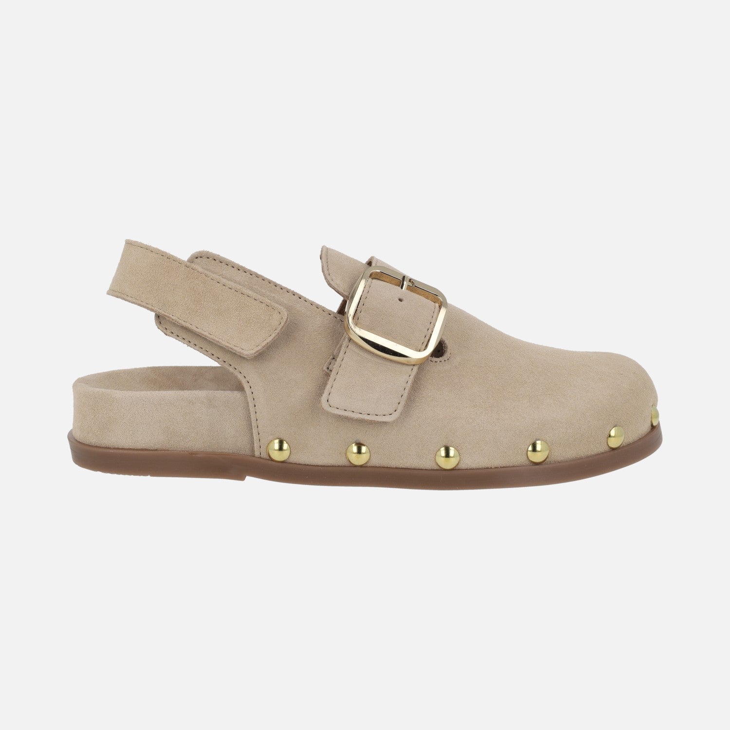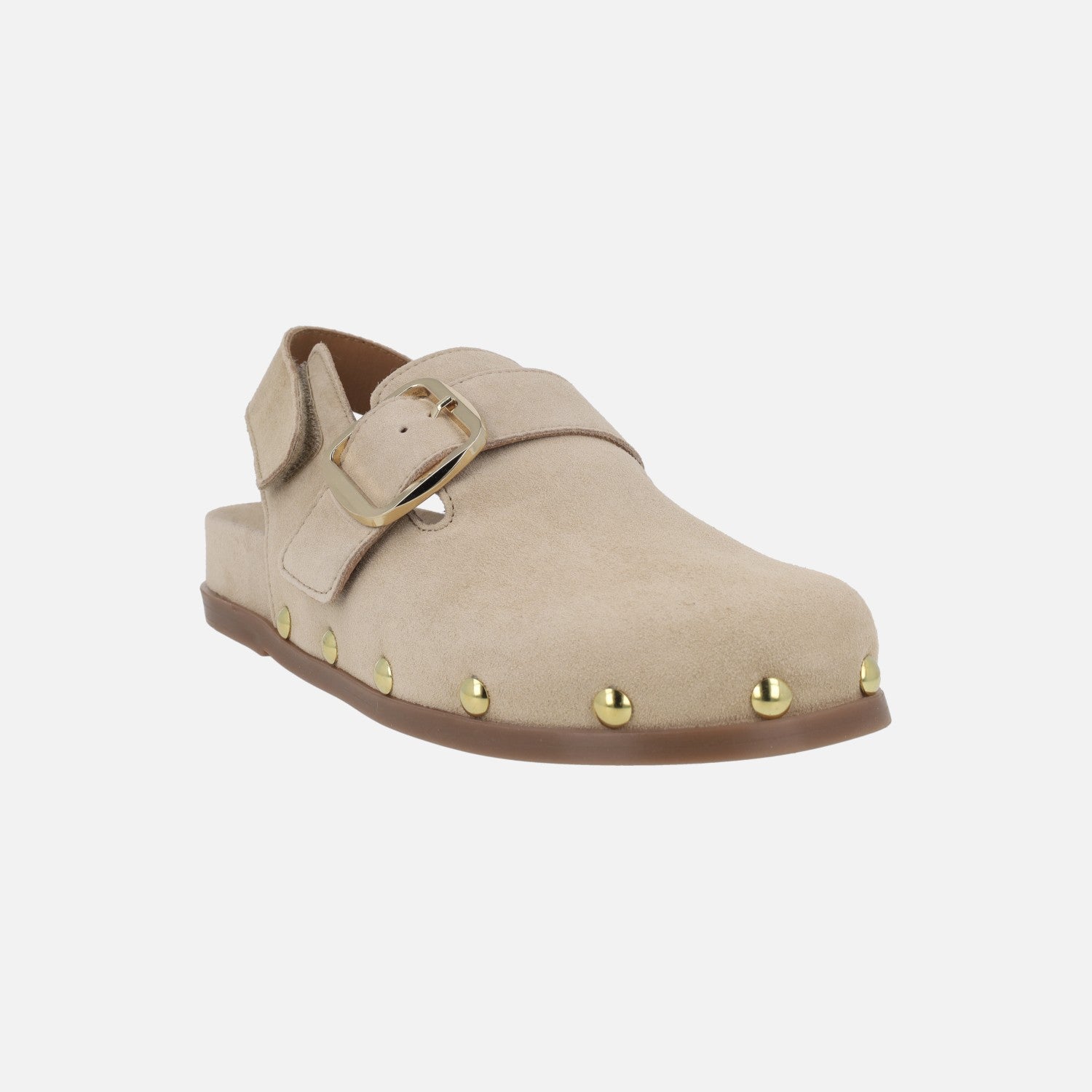 Nuevos zuecos de la marca Alpe, modelo 5396 Alive, disponibles en baby silk cuero o arena (beige). Preciosos zuecos de serraje con adorno de hebilla lateral y detalle de tachas metálicas doradas. Tira al talón con cierre ajustable de velcro. Interior textil. Plataforma de aproximadamente 3 cm de altura. Suela sintética. Made in Spain.